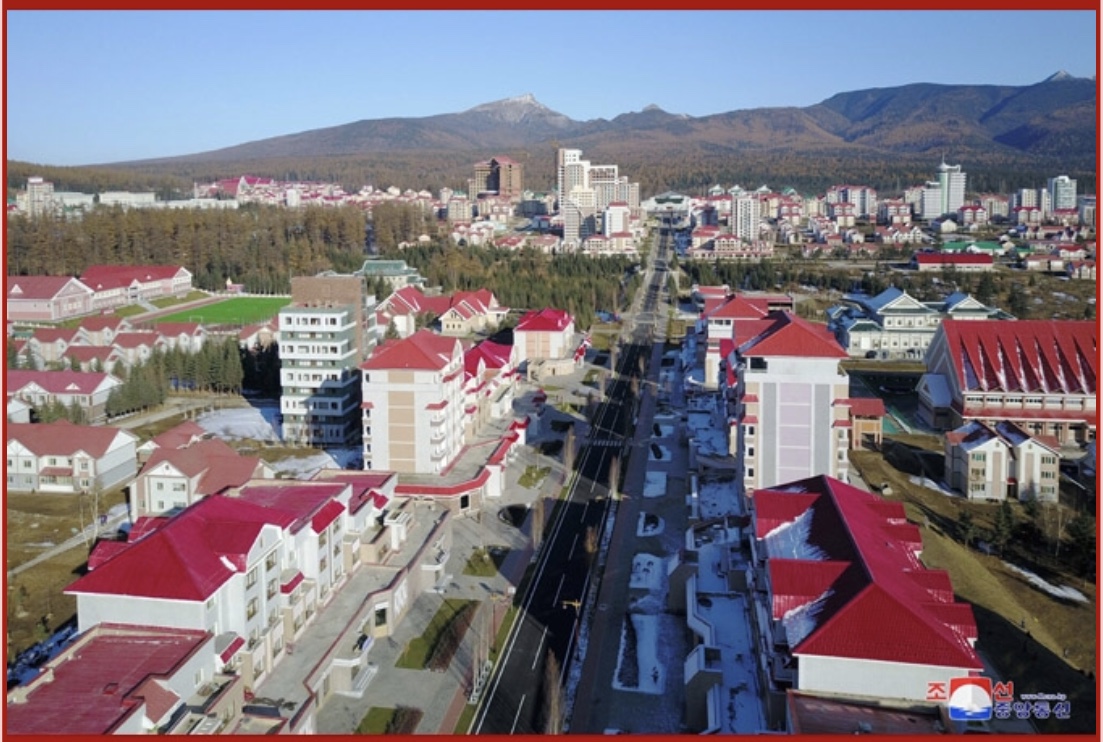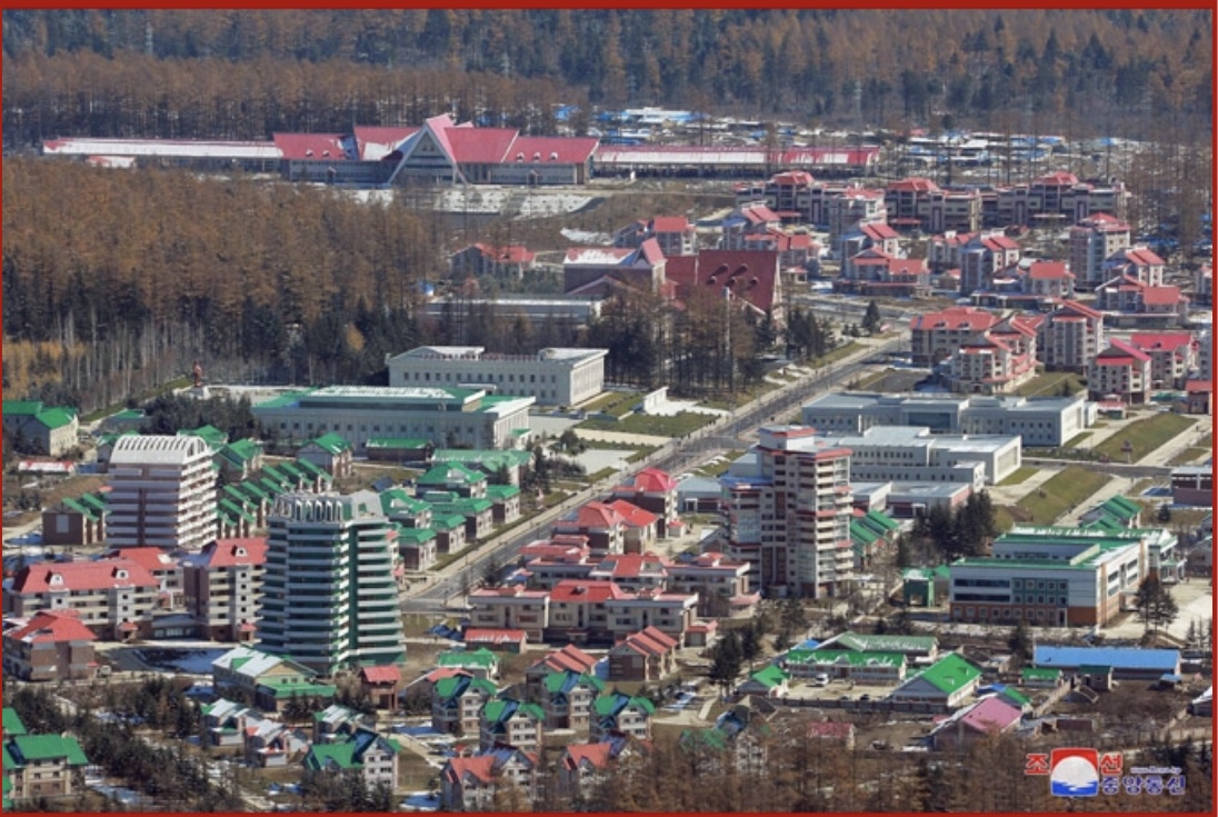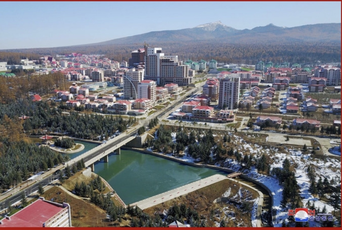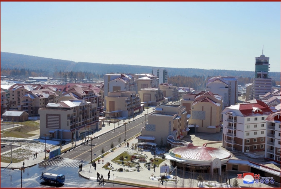 金正恩說(shuō),邑地區每座建筑物仿佛一座城市,與白頭山原始林相映成趣,也突顯出現代審美。