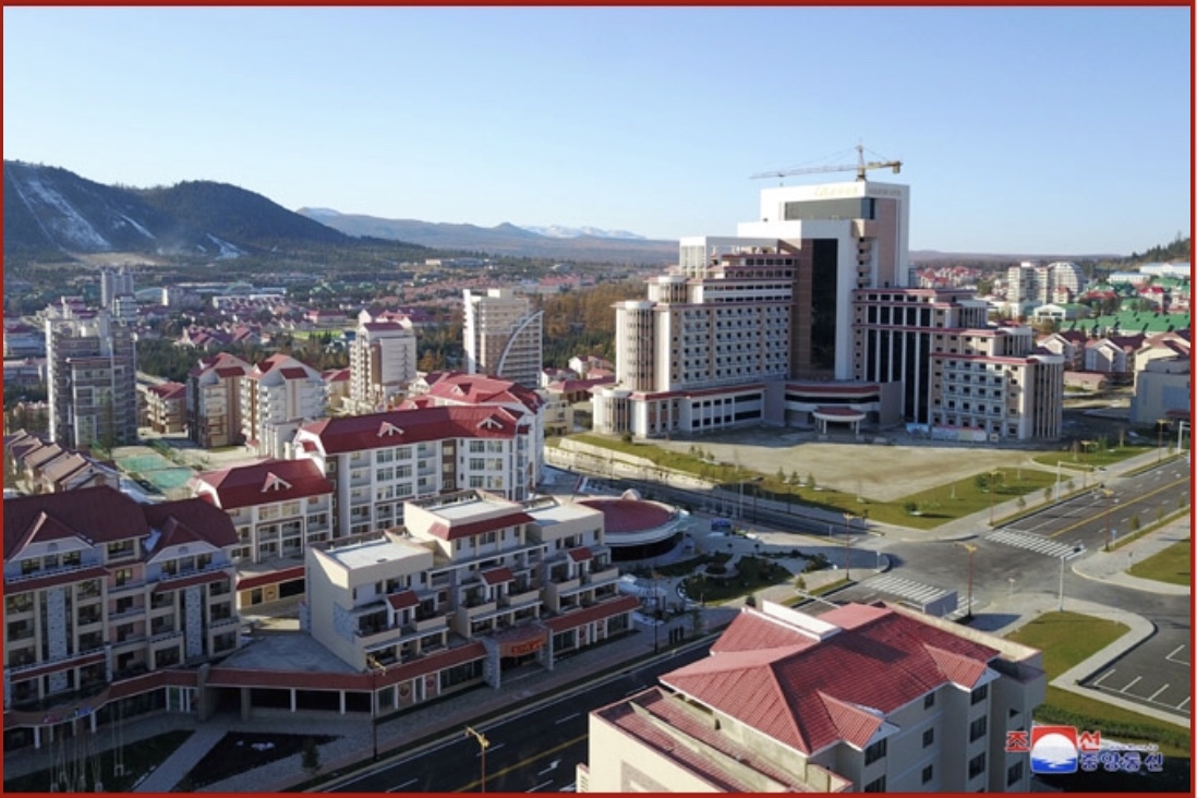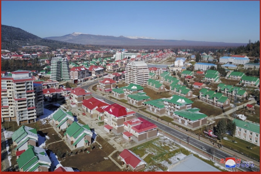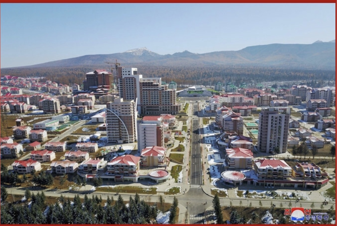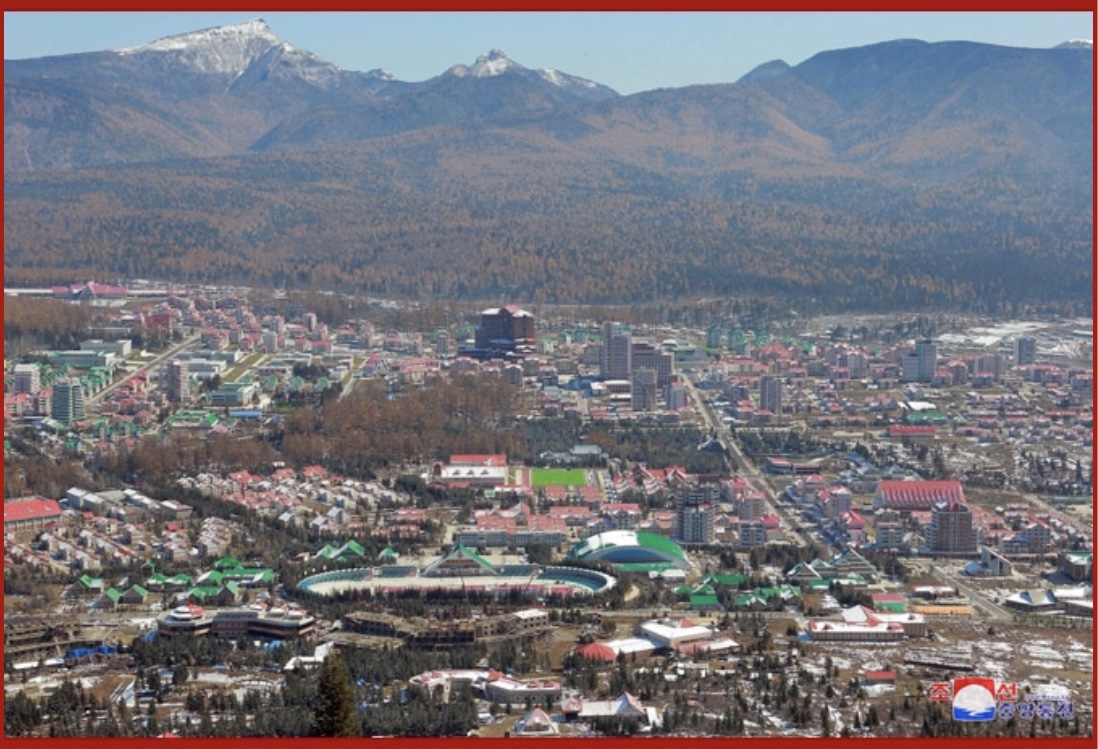 金正恩說(shuō),邑地區每座建筑物仿佛一座城市,與白頭山原始林相映成趣,也突顯出現代審美。