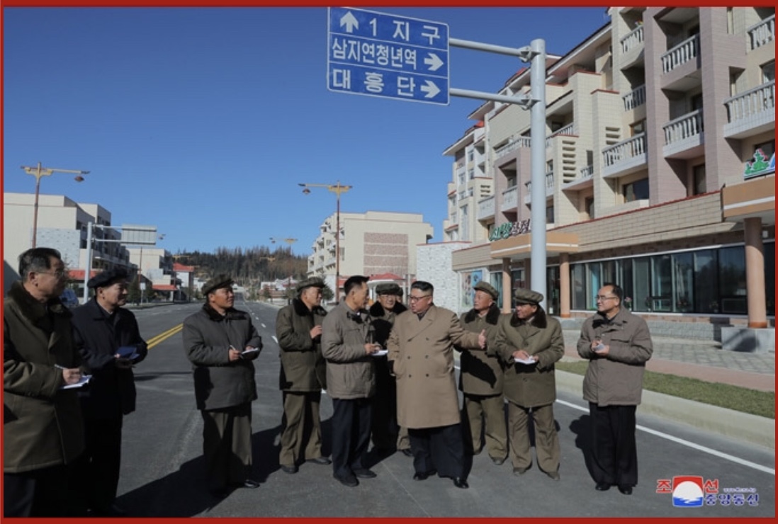 朝中社平壤10月16日電 朝鮮勞動(dòng)黨委員長(cháng)、國務(wù)委員會(huì )委員長(cháng)、武裝力量最高司令官金正恩視察第二期工程進(jìn)入收尾階段的三池淵郡內一些建設工地。