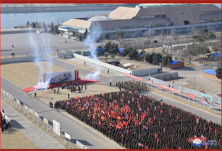 金正恩步入奠基儀式場(chǎng)時(shí),“萬(wàn)歲!”歡呼聲震撼天地,經(jīng)久不息,全體人員對金正恩熱愛(ài)人民廢寢忘食嘔心瀝血,開(kāi)創(chuàng )我們朝鮮式社會(huì )主義新的前進(jìn)道路表達敬慕之情。