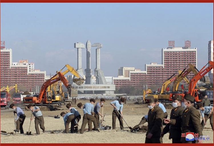 金正恩為了心愛(ài)的我國人民親自發(fā)起建設綜合醫院,并在首都中心為之選址且宣布破土動(dòng)工,彪炳千古的崇高愛(ài)民畫(huà)幅展現在工地上,全體人員激情興奮,表達對他的敬仰之情。
