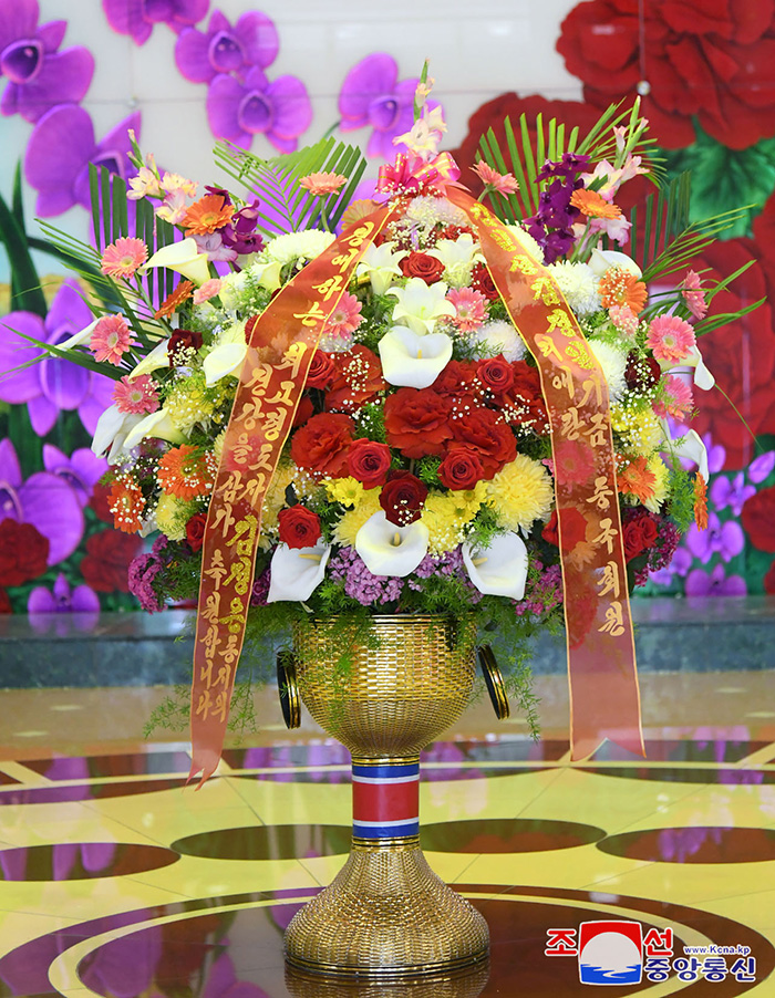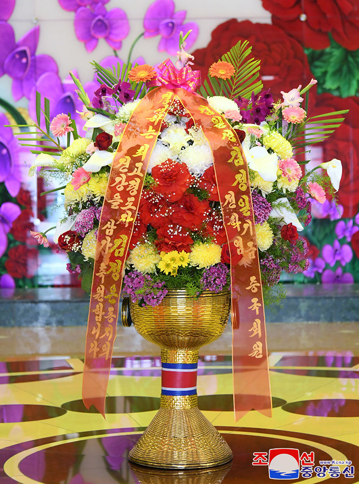 朝中社平壤5月4日電 在朝鮮最高領(lǐng)導人金正恩出任朝鮮勞動(dòng)黨委員長(cháng)4周年之際,金日成金正日基金理事會(huì )會(huì )員趙斌、戰學(xué)艷、和李?lèi)?ài)蘭4日送來(lái)花籃。(完)