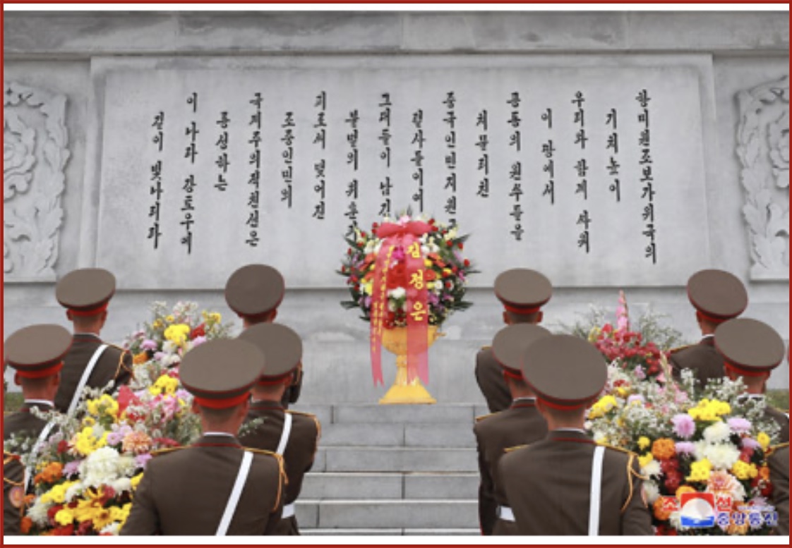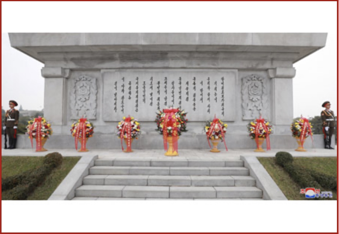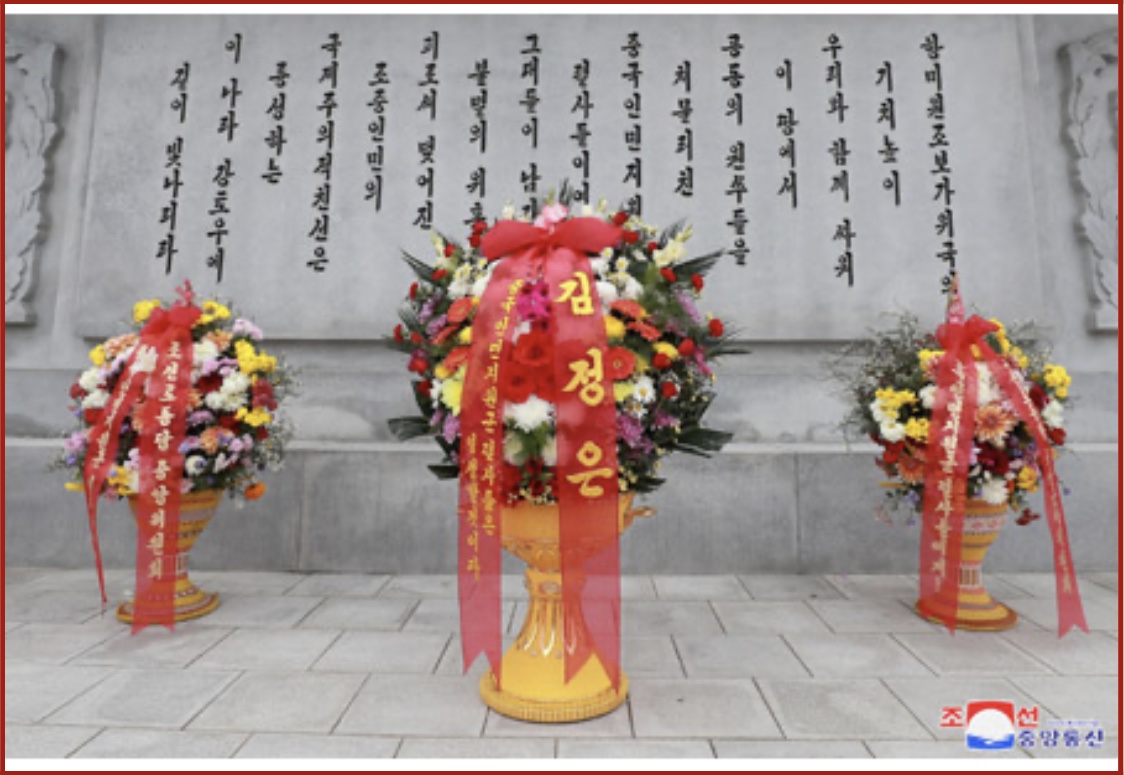 以敬愛(ài)的最高領(lǐng)導者金正恩同志名義的花籃敬獻在友誼塔前。