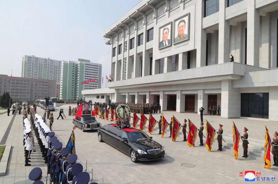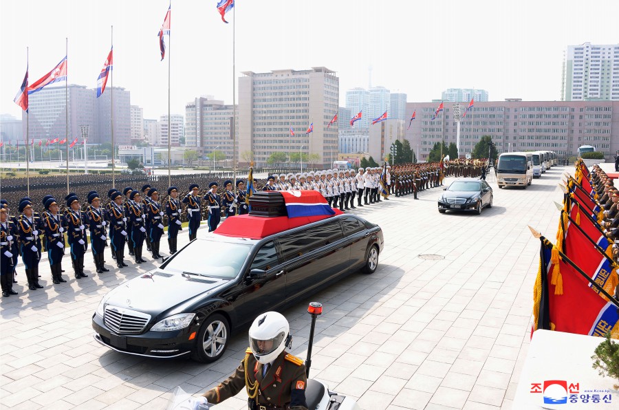 靈車(chē)經(jīng)過(guò)向玄哲海同志靈柩表示崇高敬禮的朝鮮人民軍軍旗縱隊和儀仗隊前,在摩托車(chē)的護衛下駛向大街。