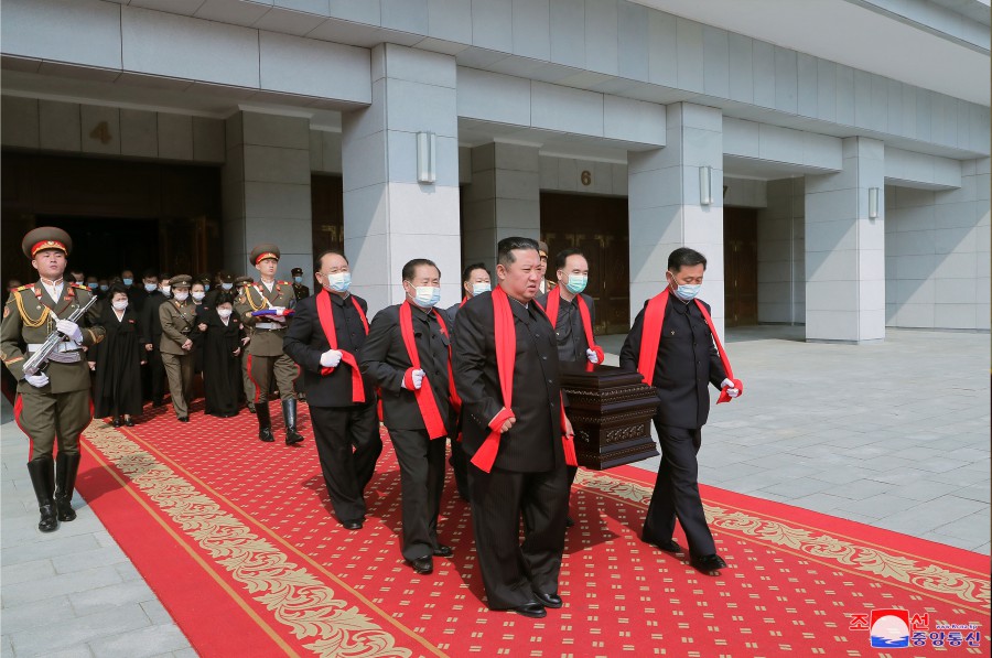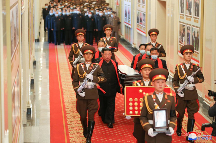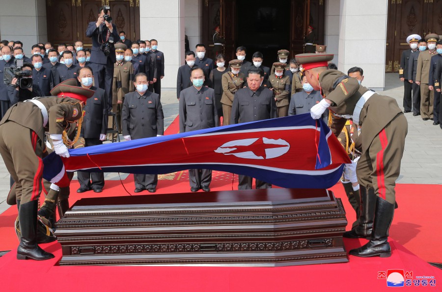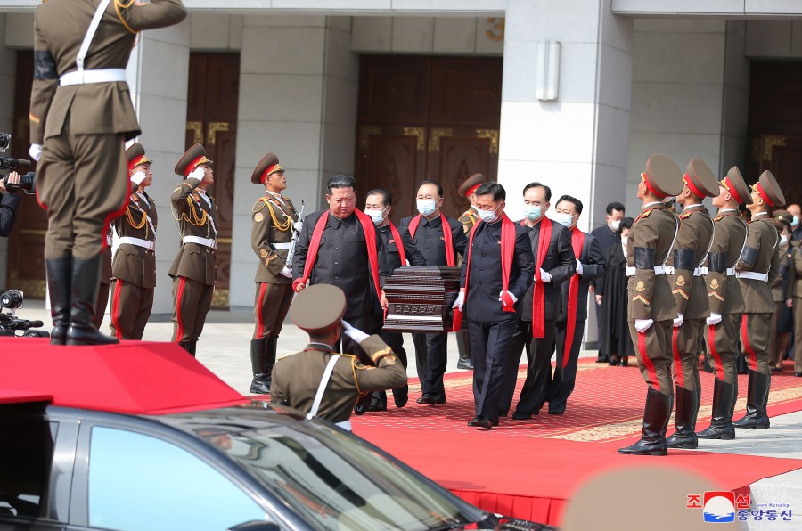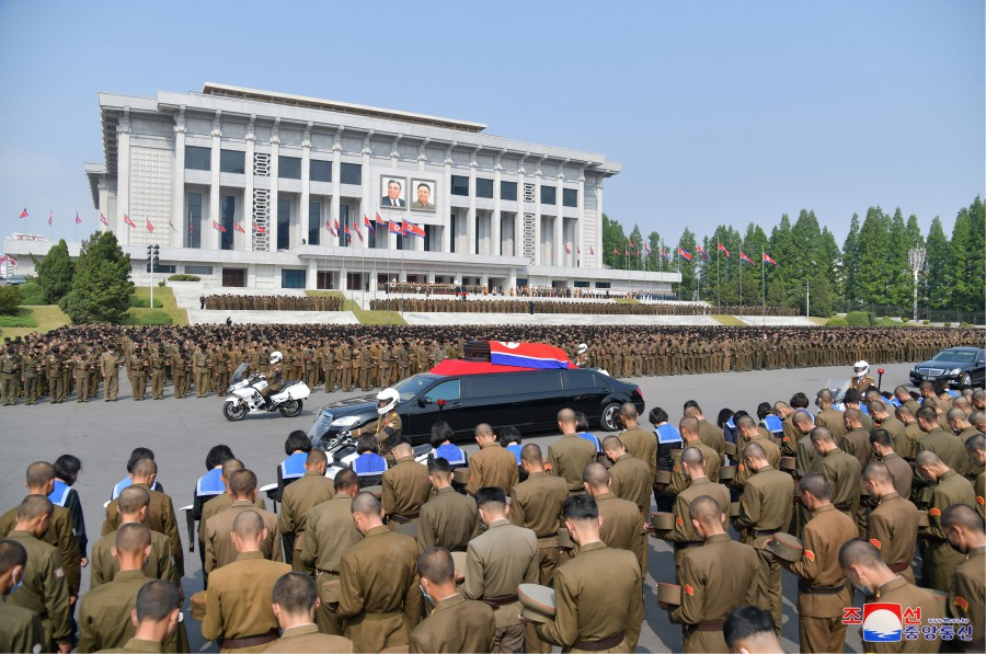 反映全體朝鮮人民軍官兵的敬意,儀仗隊隊員把神圣的光榮之旗——朝鮮民主主義人民共和國國旗肅穆地蓋在靈柩上。