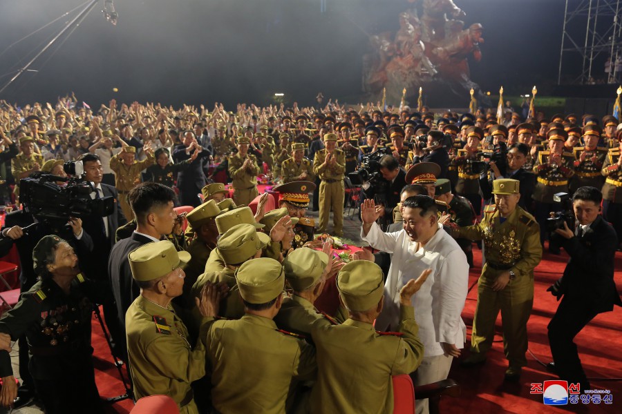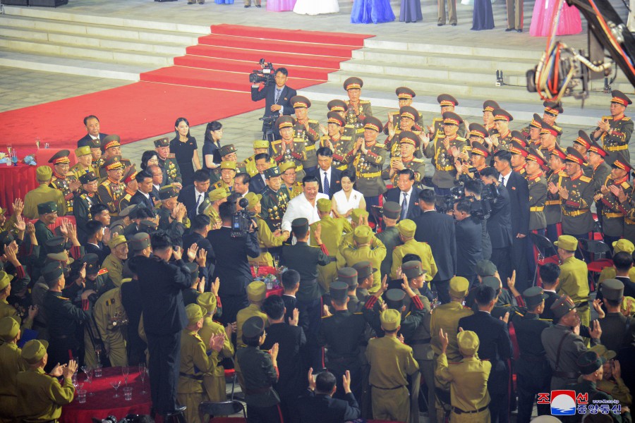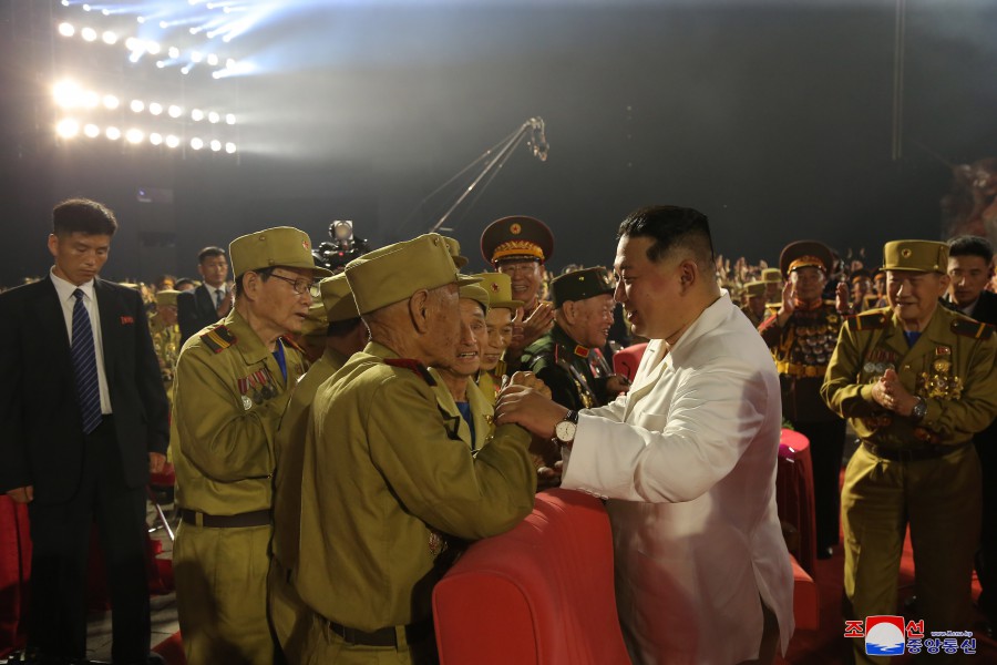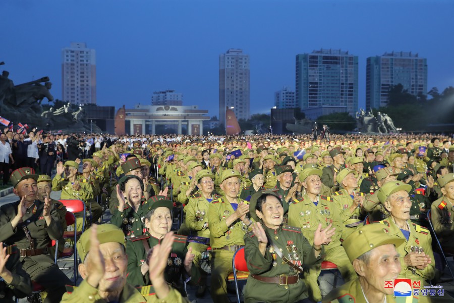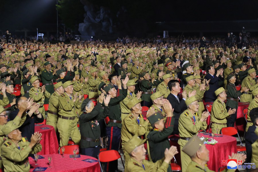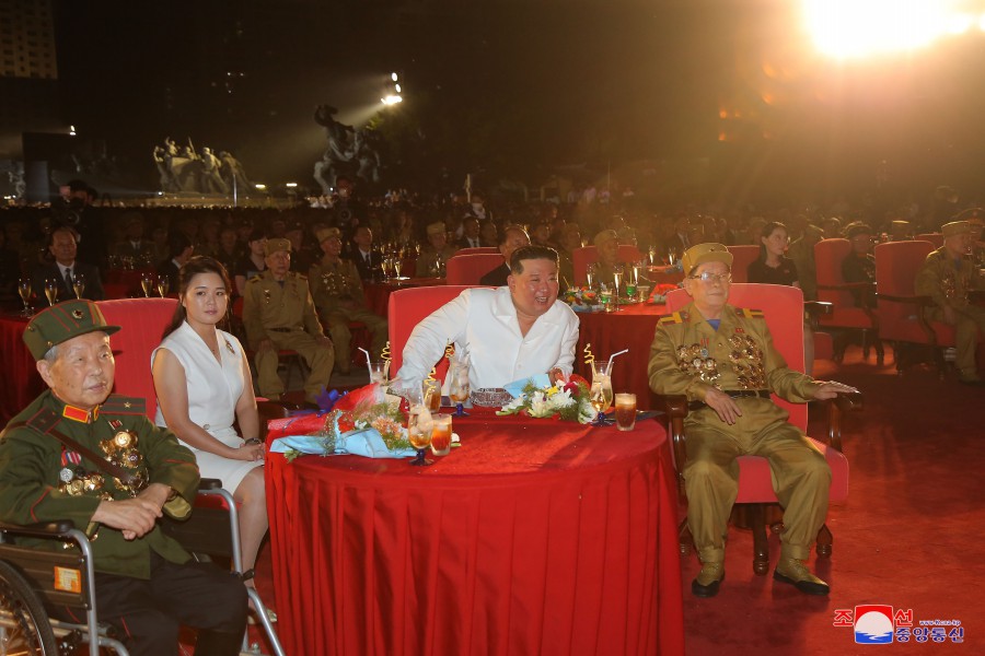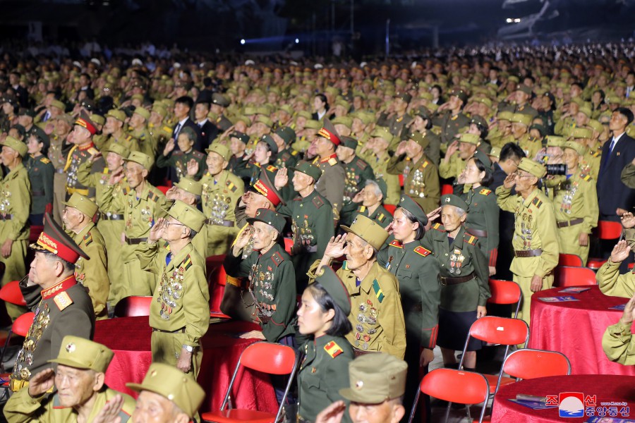 在歡迎曲樂(lè )聲中,敬愛(ài)的總書(shū)記同志和李雪主女士同參戰老兵一起出場(chǎng)。
