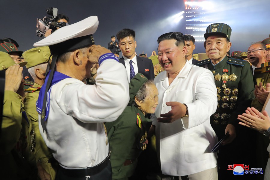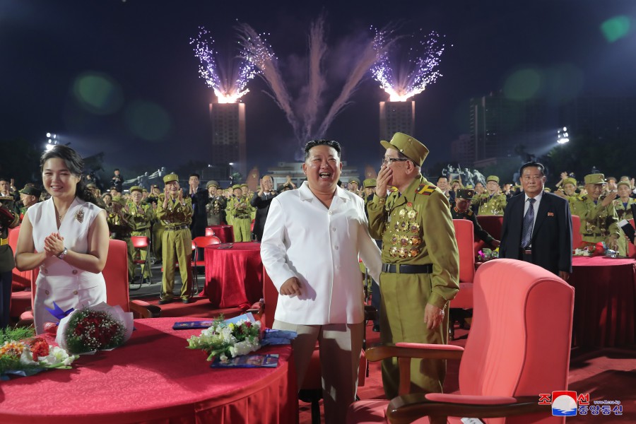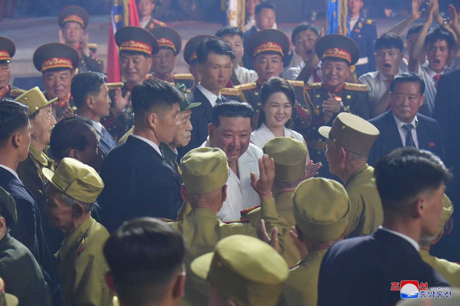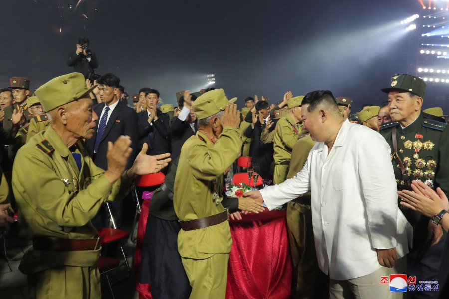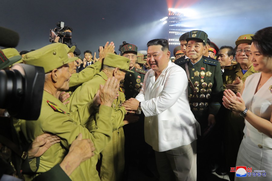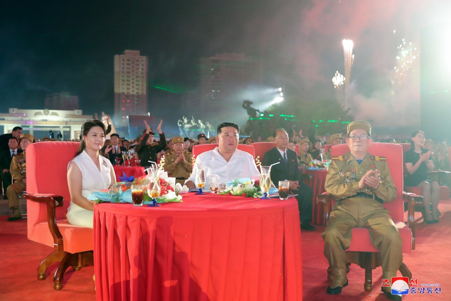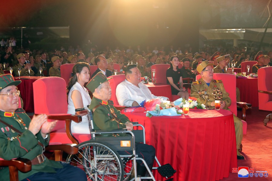 在歡迎曲樂(lè )聲中,敬愛(ài)的總書(shū)記同志和李雪主女士同參戰老兵一起出場(chǎng)。