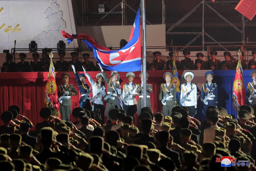 朝鮮人民軍儀仗隊員們舉起朝鮮民主主義人民共和國國旗,合著(zhù)《我們的國旗》旋律正步行進(jìn),莊嚴入場(chǎng)。