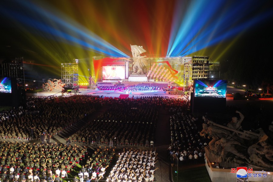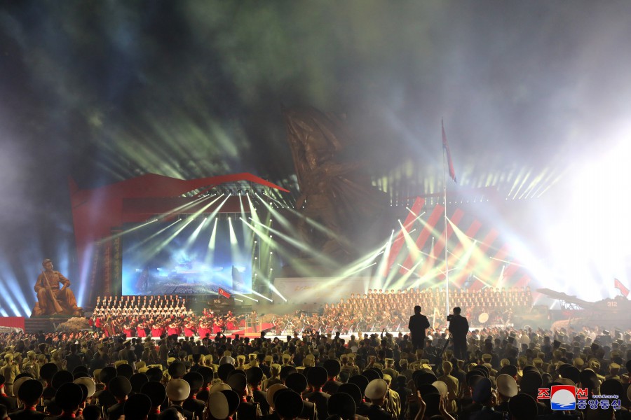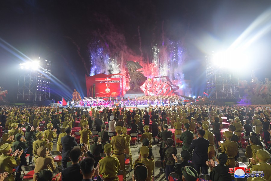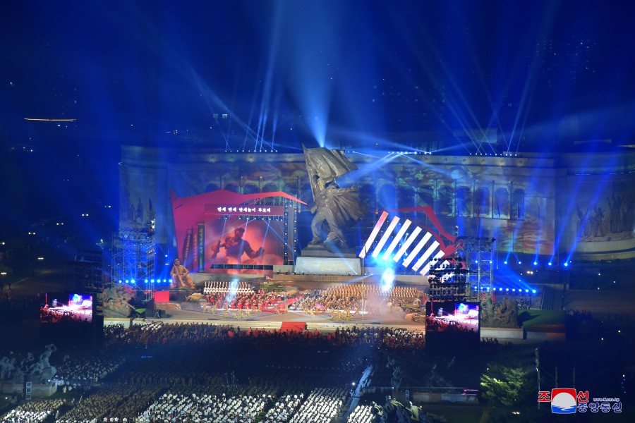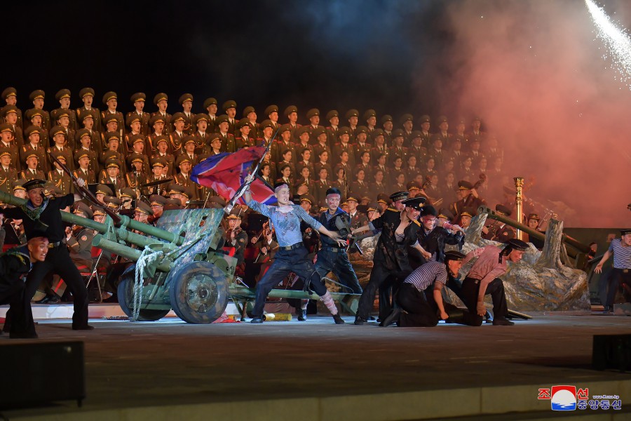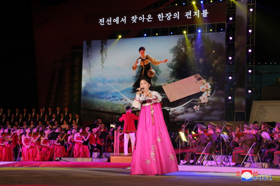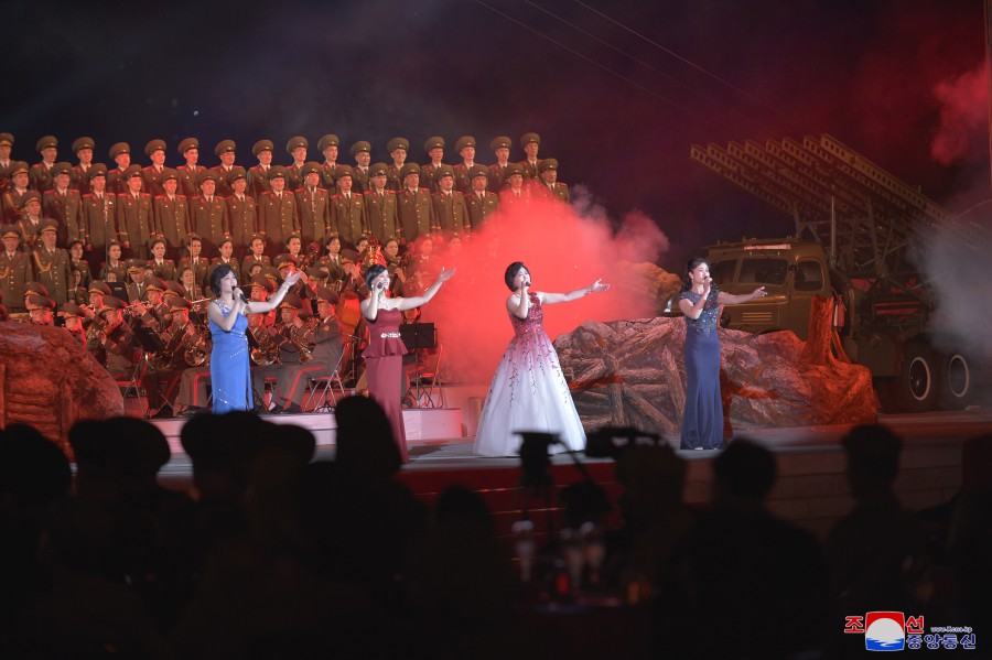 《為了唯一無(wú)二的祖國》等戰勝年代人的崇高精神和靈魂激烈沸騰的歌曲陸續登臺,舞臺久久蕩漾著(zhù)對持步兵槍擊毀原子彈,拯救祖國命運和未來(lái),把英雄朝鮮、英雄人民這一偉大名譽(yù)與榮耀留給后代的勝利者的敬意之情。