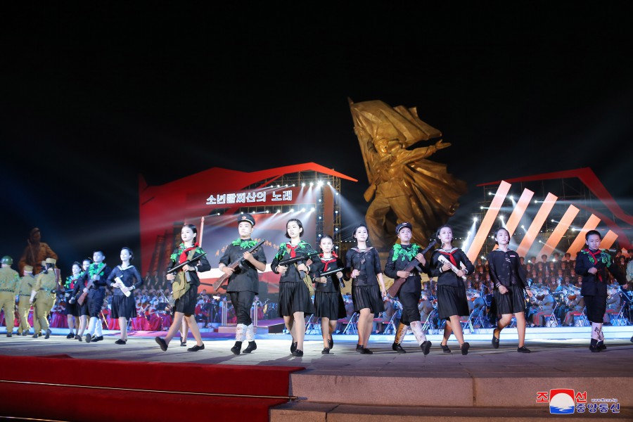 勞動(dòng)黨時(shí)代的戰勝贊歌《戰勝禮花啊,說(shuō)吧》、《我們的7·27》裝點(diǎn)終場(chǎng),演出更加堅定了整場(chǎng)觀(guān)眾要為了實(shí)現我國革命的第一代、第二代在槍林彈雨中憧憬的富國強兵、為了保衛世上任何強敵都不敢藐視的社會(huì )主義朝鮮的絕對國威,跟隨