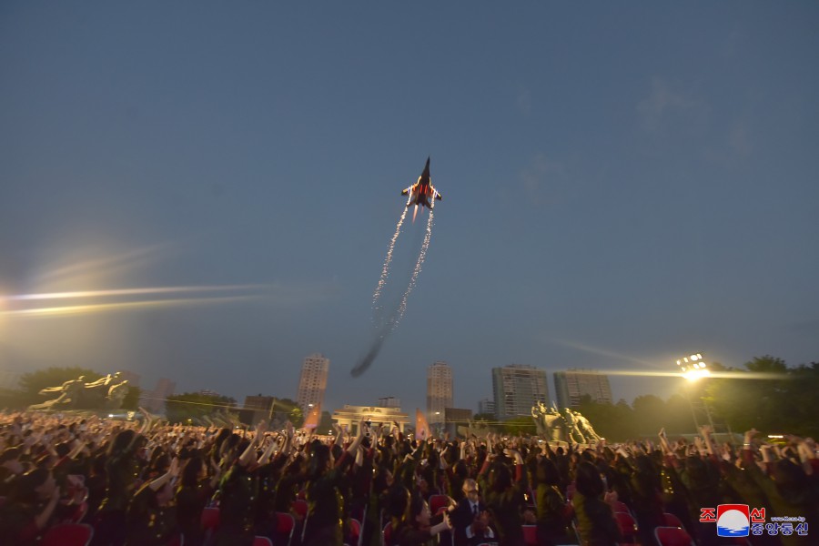 在祖國解放戰爭時(shí)期率先打開(kāi)南下沖鋒路、建樹(shù)赫赫戰功,獲授近衛部隊稱(chēng)號的朝鮮人民軍空軍部隊戰斗飛行員進(jìn)行了飛行特技表演。