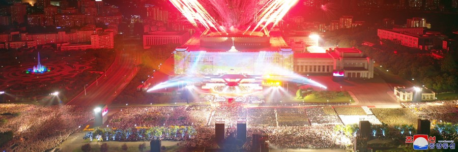 在全體朝鮮人民一致的意志下樹(shù)立并在絕對支持和信賴(lài)下顯示戰無(wú)不勝之威力的共和國政權的威儀映在首都中心作為勞動(dòng)黨時(shí)代的大紀念碑巍然矗立的萬(wàn)壽臺議事堂,以其為背景,大型演出開(kāi)始。
