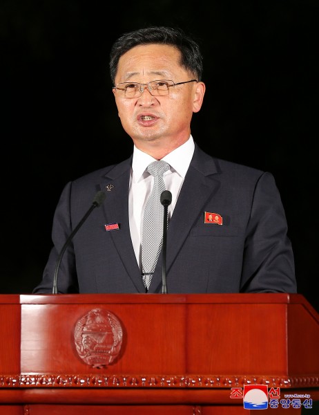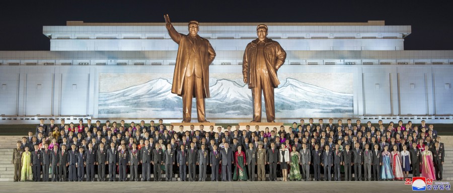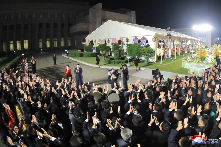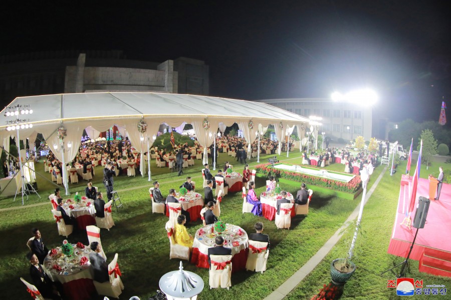 在敬愛(ài)的金正恩同志和尊敬的李雪主女士出席下,祝賀勞模和有功者的盛大宴會(huì )在萬(wàn)壽臺議事堂庭院舉行。
