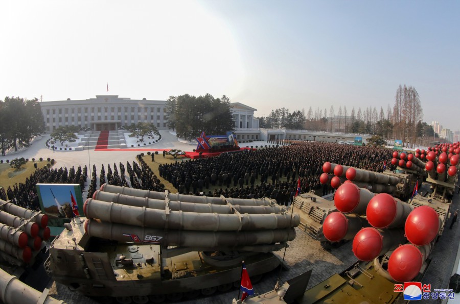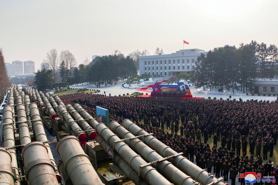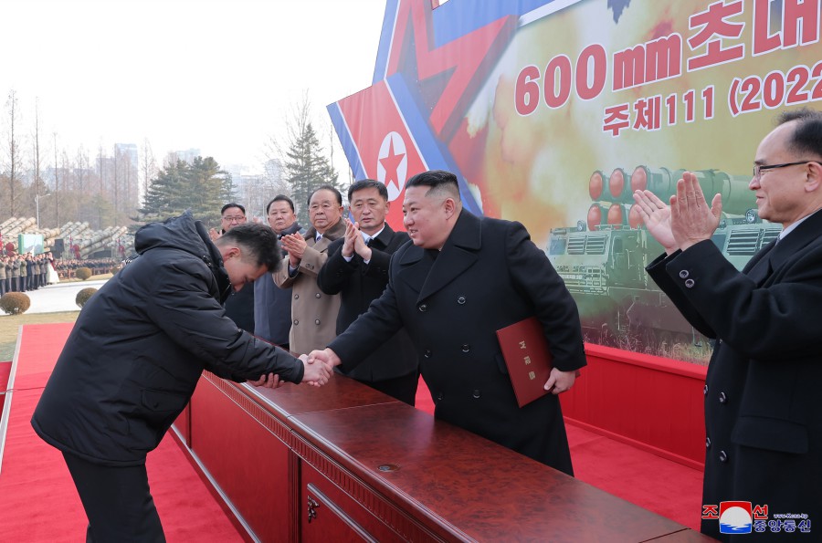 軍工部門(mén)工人階級獻給朝鮮勞動(dòng)黨第八屆中央委員會(huì )第六次全體會(huì )議的600毫米超大型火箭炮贈送儀式12月31日在黨中央委員會(huì )本部大樓大院隆重舉行。