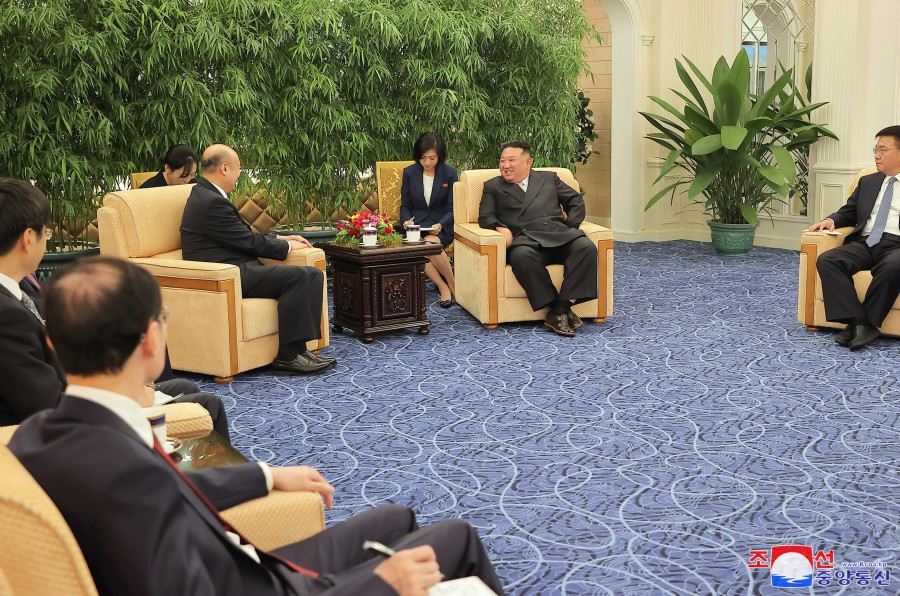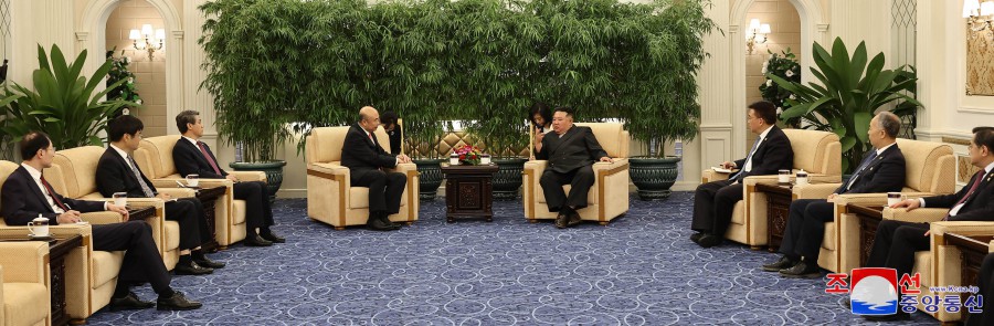 金正恩同志熱情迎接以中國共產(chǎn)黨中央委員會(huì )政治局委員、國務(wù)院副總理劉國中為團長(cháng)的中華人民共和國黨政代表團成員,并在親切友好的氣氛中進(jìn)行交談。