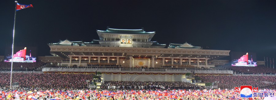 在國旗護衛隊的護衛下,朝鮮人民軍儀仗隊隊員托著(zhù)朝鮮民主主義人民共和國國旗,走入我國人民有意義地慶祝心愛(ài)的國家充滿(mǎn)光榮的75年歷史的喜悅激烈蕩漾的廣場(chǎng)。