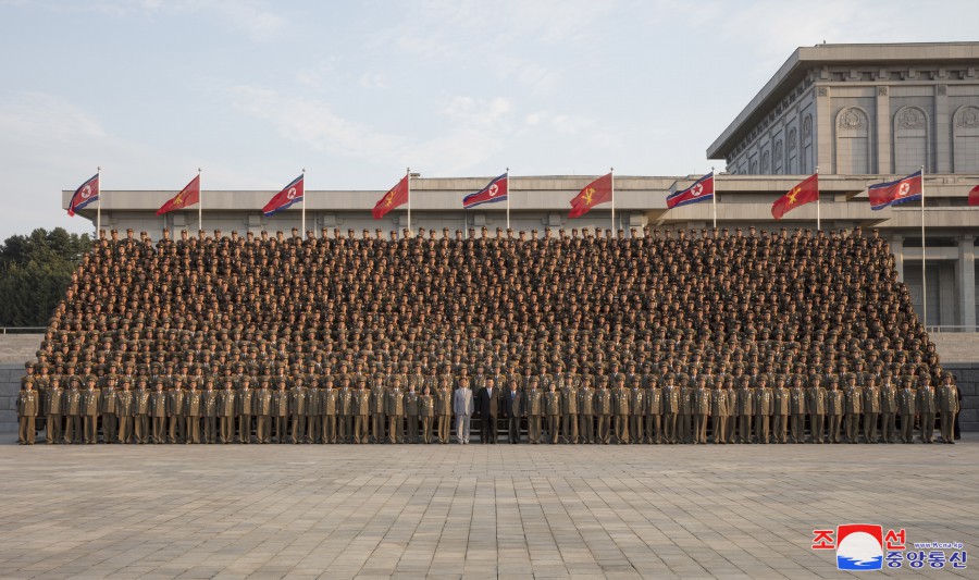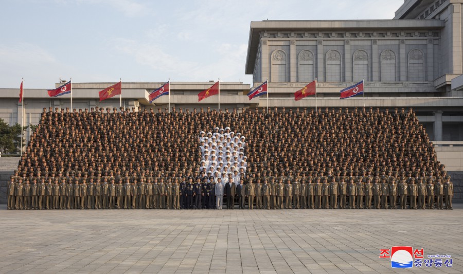 朝中社平壤9月10日電 朝鮮勞動(dòng)黨總書(shū)記、朝鮮民主主義人民共和國國務(wù)委員長(cháng)金正恩同志9月9日同共和國成立75周年慶?;顒?dòng)參加者合影留念。