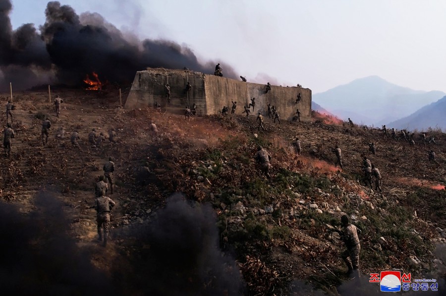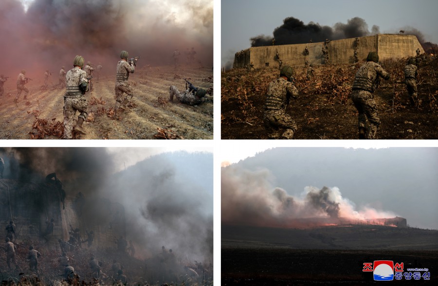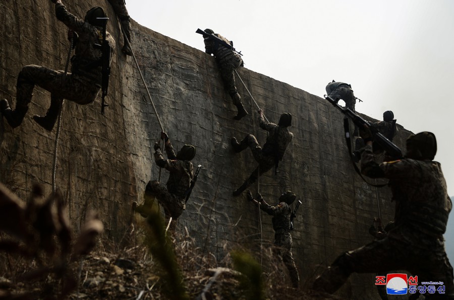 金正恩同志滿(mǎn)意地看著(zhù)空降兵一下子就占領(lǐng)假設敵軍主要軍事對象目標的戰斗訓練場(chǎng)景,高興地說(shuō):從他們那驍勇的姿態(tài)可以看出我軍百戰百勝的戰斗能力和剛勇氣概。