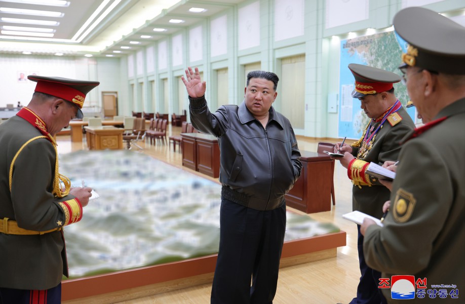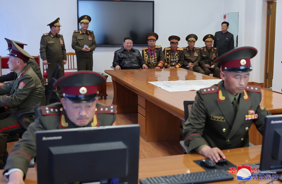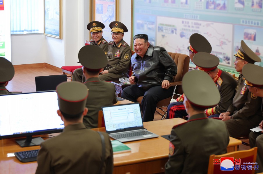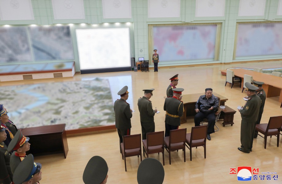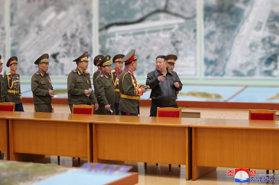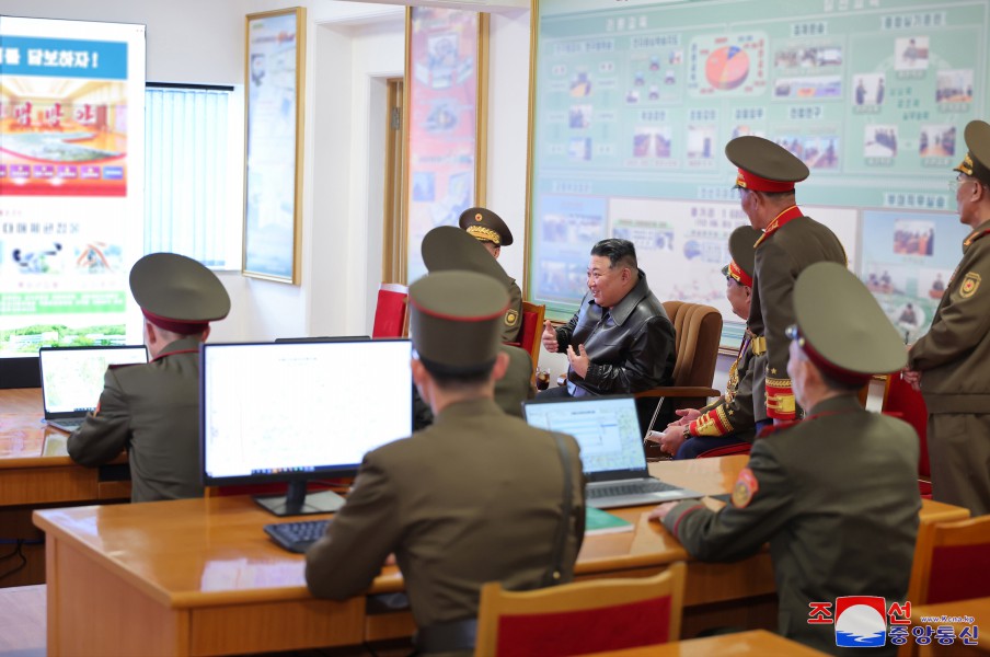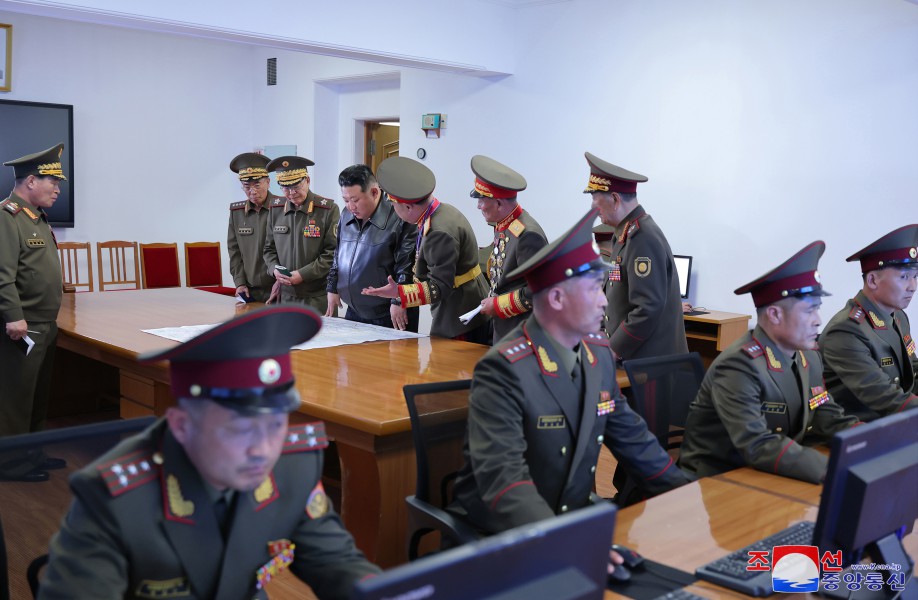 敬愛(ài)的金正恩同志在作戰研究室了解敵人的主要作戰行動(dòng)企圖、對敵軍的研究情況、師生擬定的軍種、軍團作戰計劃,并指出了在現代作戰中堅持且付諸實(shí)踐的重要原則問(wèn)題。