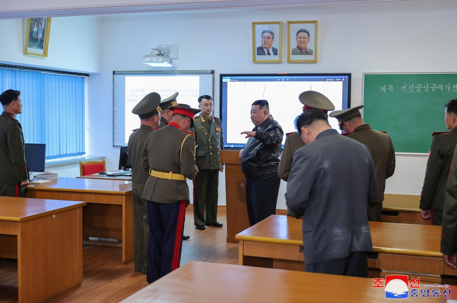 金正恩同志來(lái)到軍事講堂觀(guān)摩作戰戰術(shù)課后,巡視教育方法研究及訓練室,具體了解了教育情況。