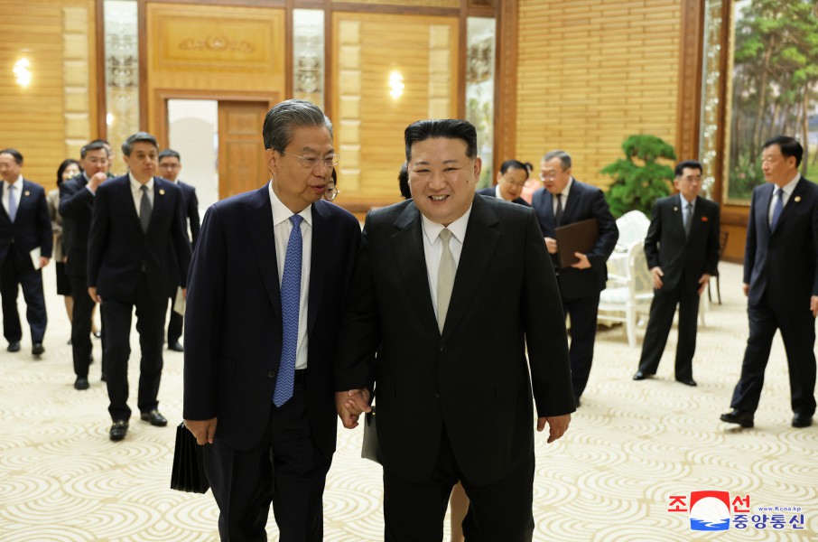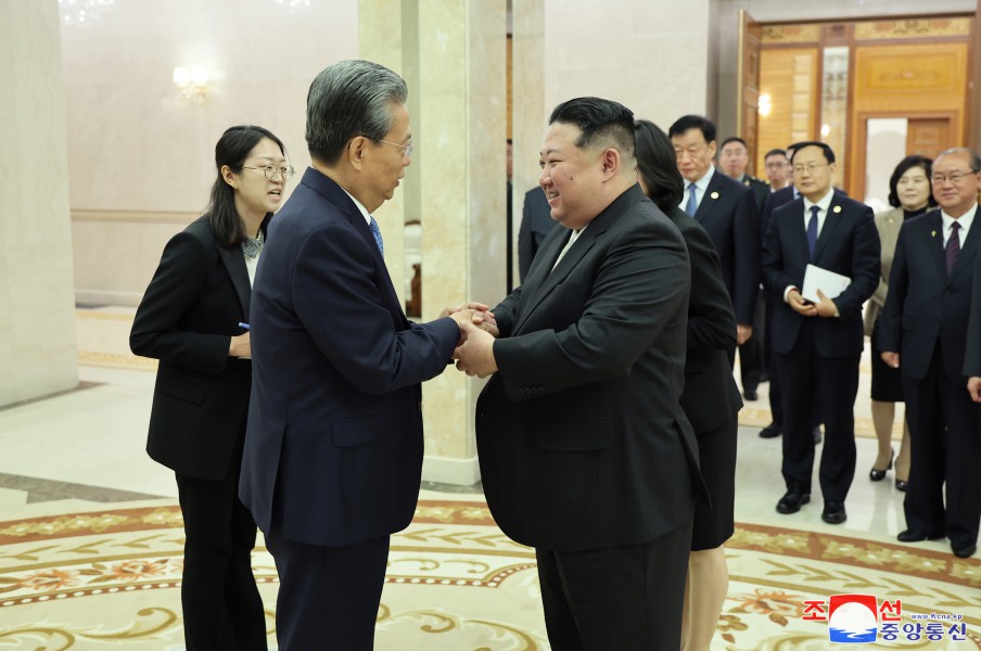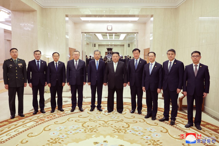 敬愛(ài)的金正恩同志在黨中央委員會(huì )本部大樓熱情迎接中華人民共和國黨政代表團成員,熱烈歡迎代表團訪(fǎng)問(wèn)朝鮮,并同他們合影留念。