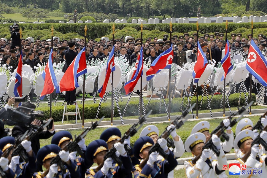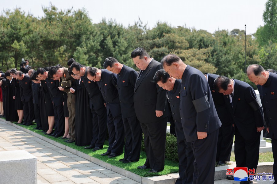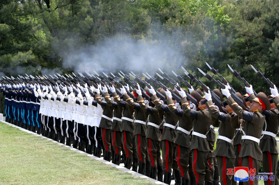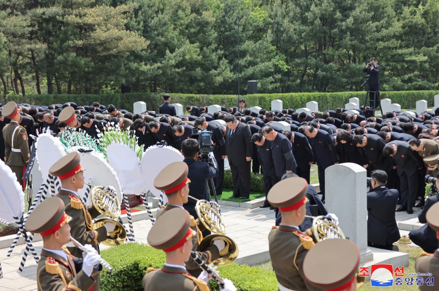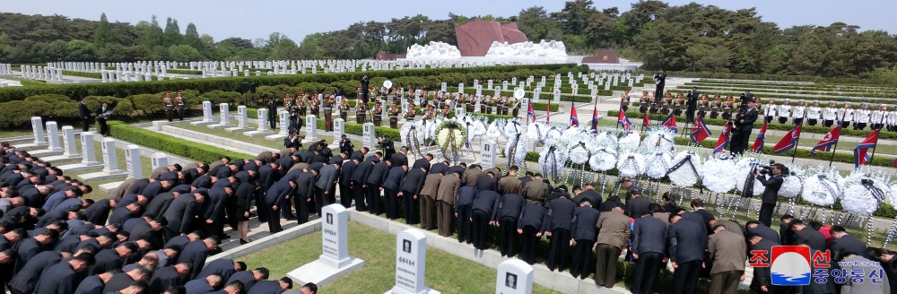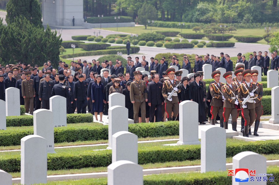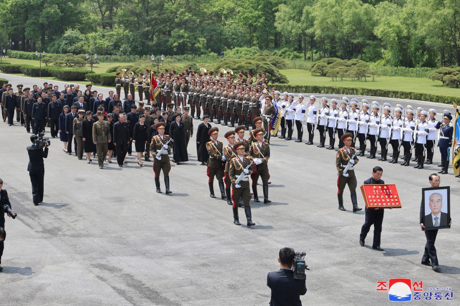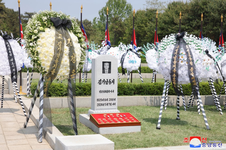 以朝鮮勞動(dòng)黨中央委員會(huì )、朝鮮民主主義人民共和國最高人民會(huì )議常任委員會(huì )、朝鮮民主主義人民共和國內閣名義敬獻的花圈在墳墓前一字擺開(kāi)。
