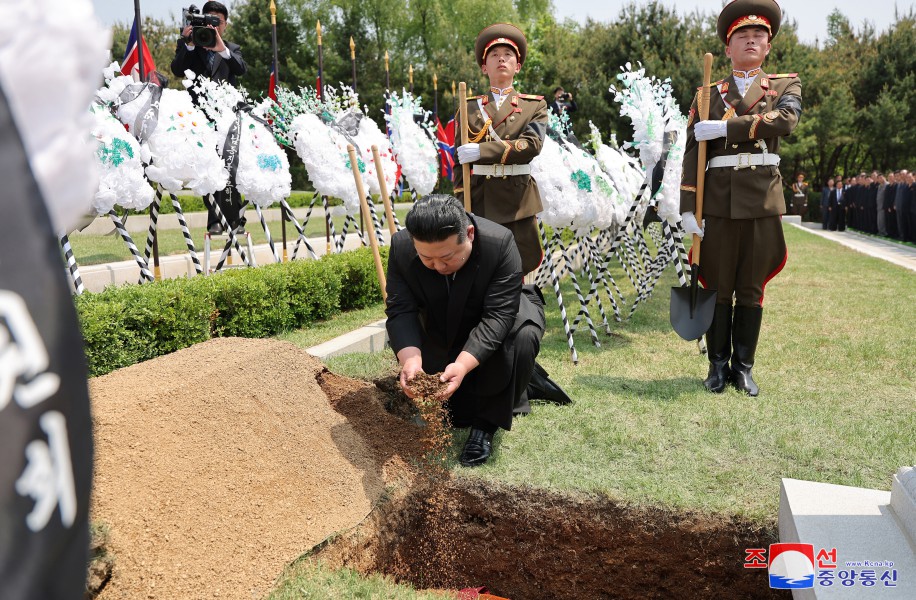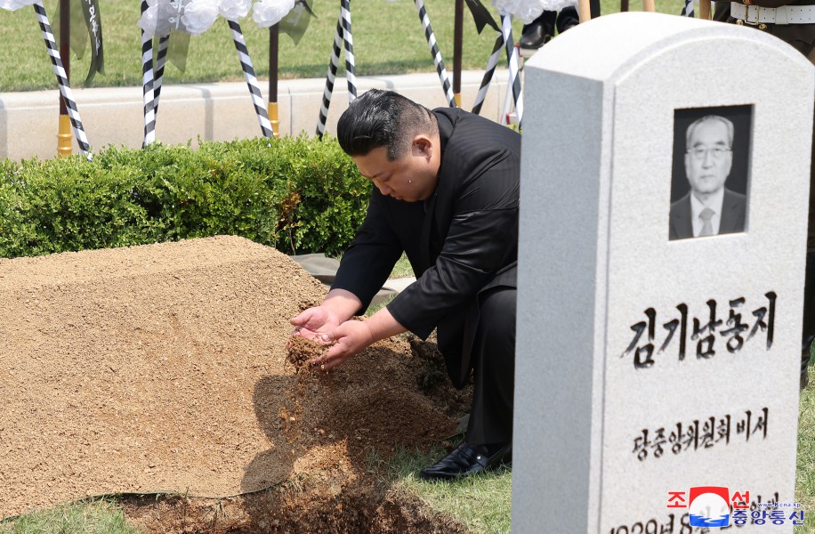 朝鮮勞動(dòng)黨中央委員會(huì )政治局常務(wù)委員會(huì )委員和故人家屬往故人遺體蓋了土。