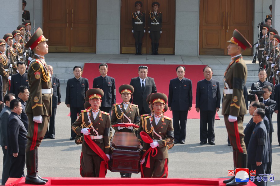 朝鮮人民軍儀仗隊列隊迎接靈柩。