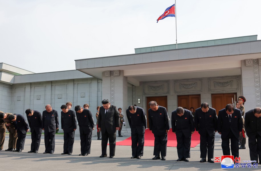 在安放故人靈柩的西將會(huì )館國旗半降,朝鮮人民軍儀仗隊整齊列隊。