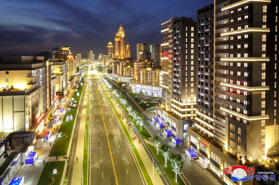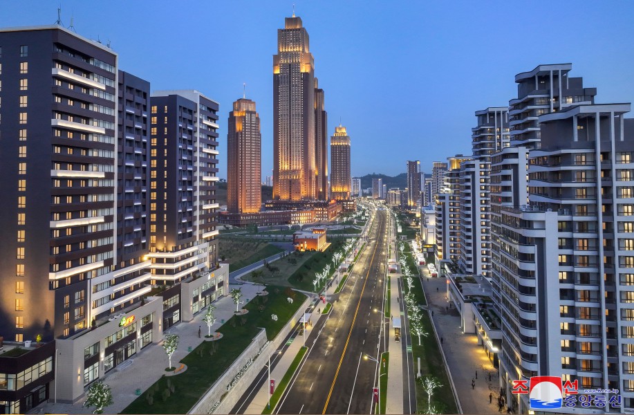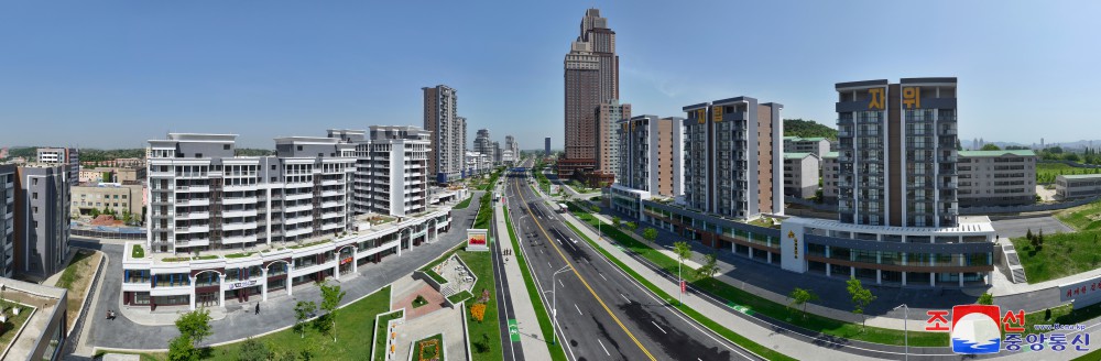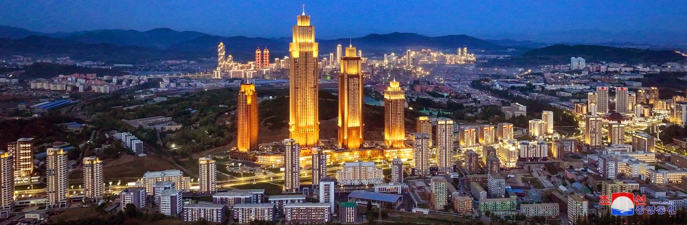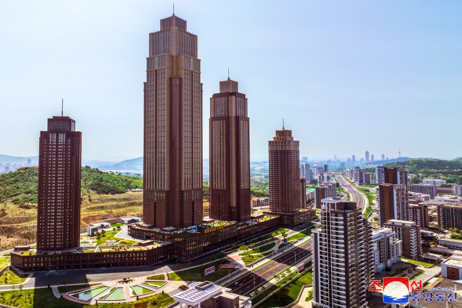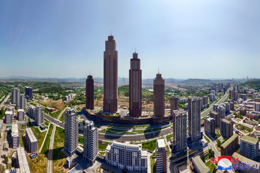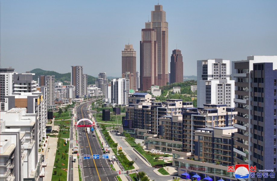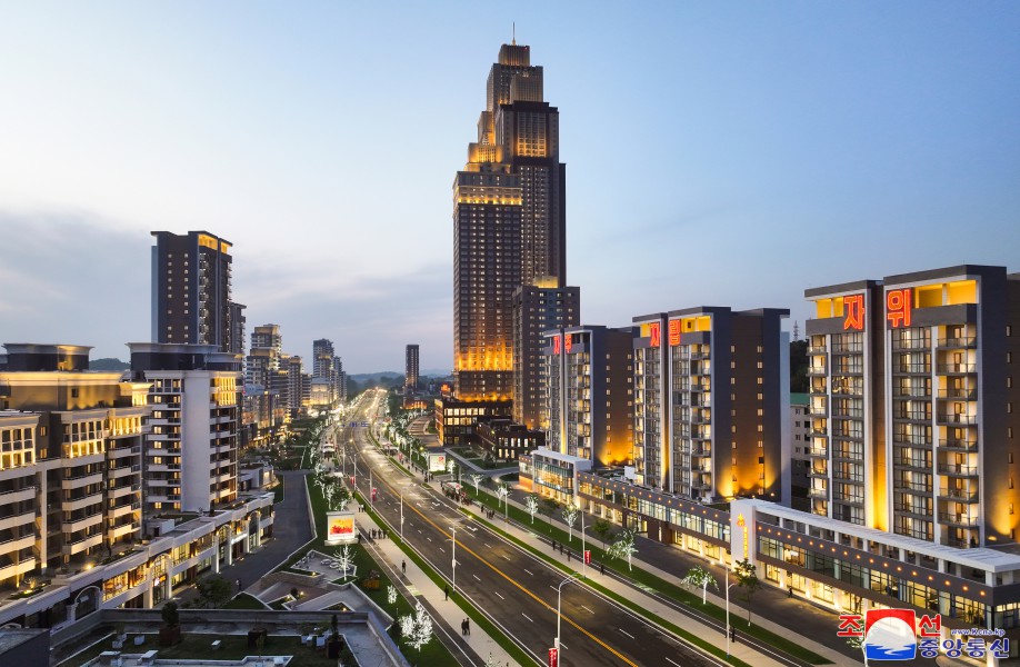 80層高樓等形式各樣的高層、超高層樓房和公共建筑物展現在眼前,蔚為壯觀(guān)。這座大建筑群是以熱烈的愛(ài)國心擁護并保衛黨的事業(yè)的可靠青年先鋒獻禮祖國和人民的驕傲勞動(dòng)成果,是朝鮮式社會(huì )主義蓬勃前進(jìn)的產(chǎn)物。