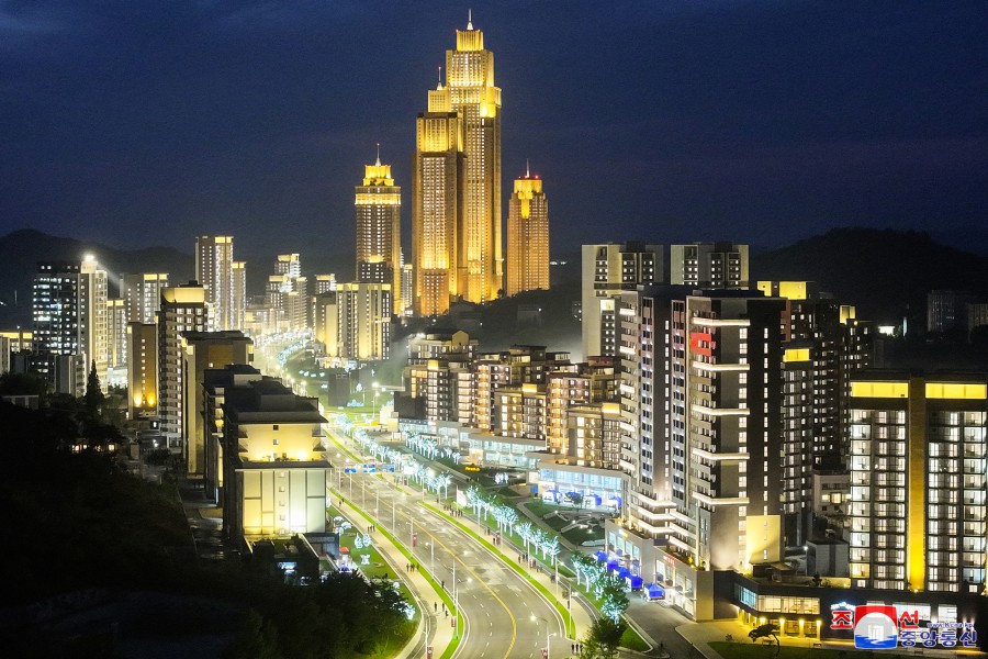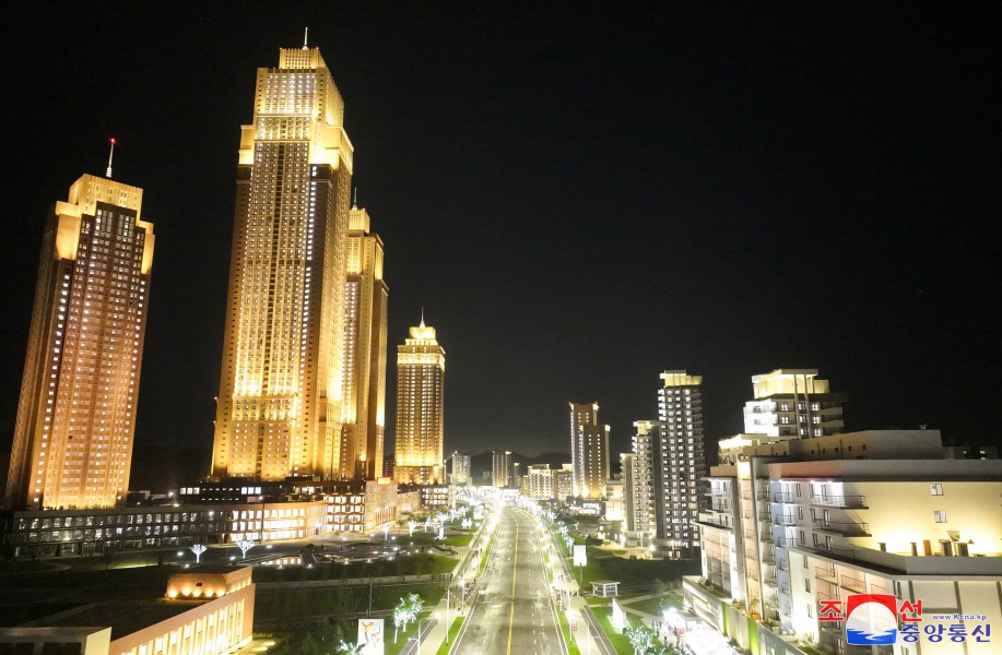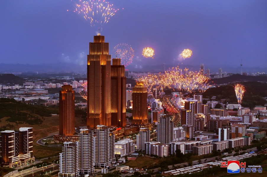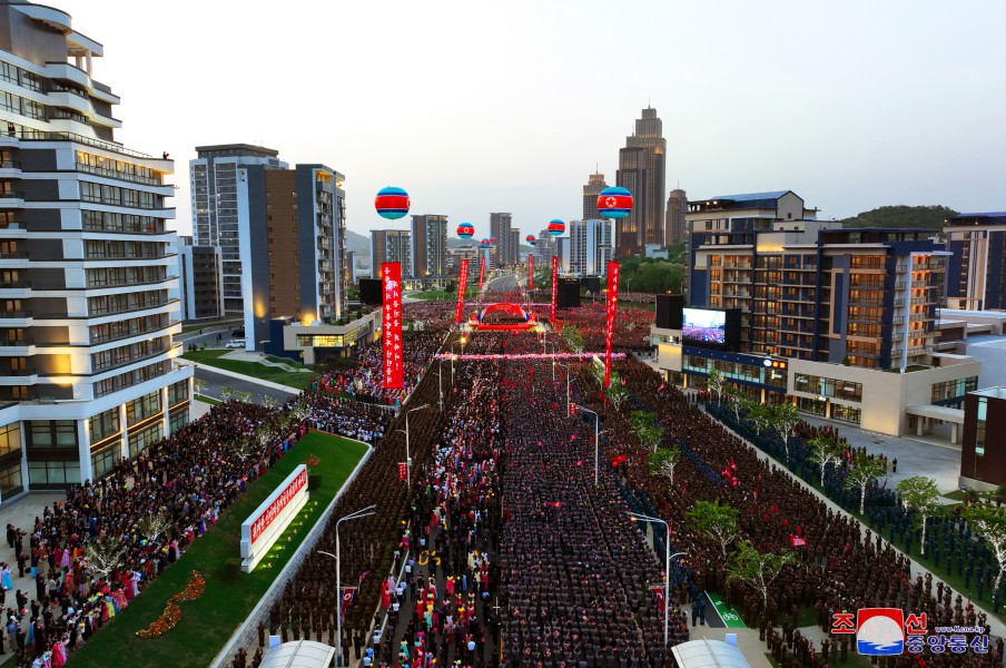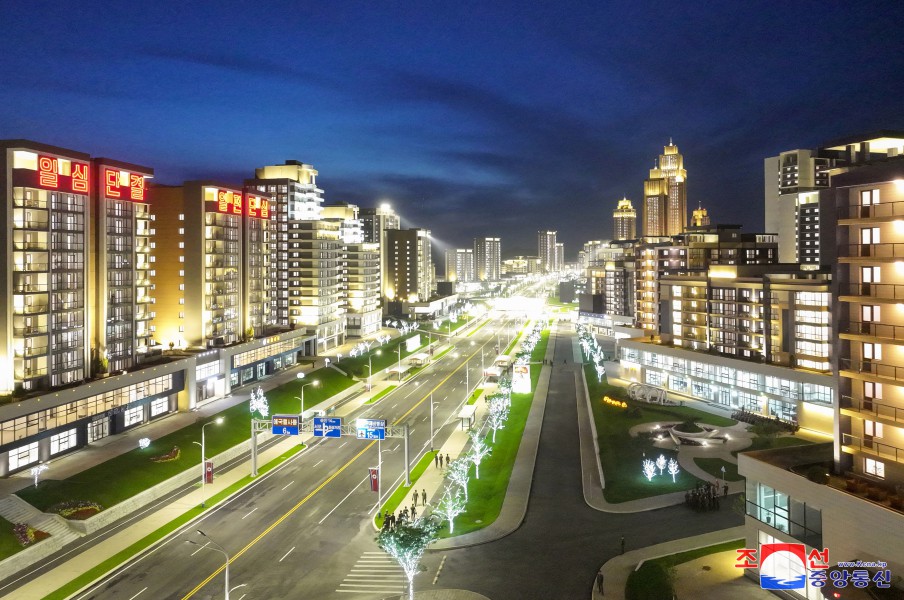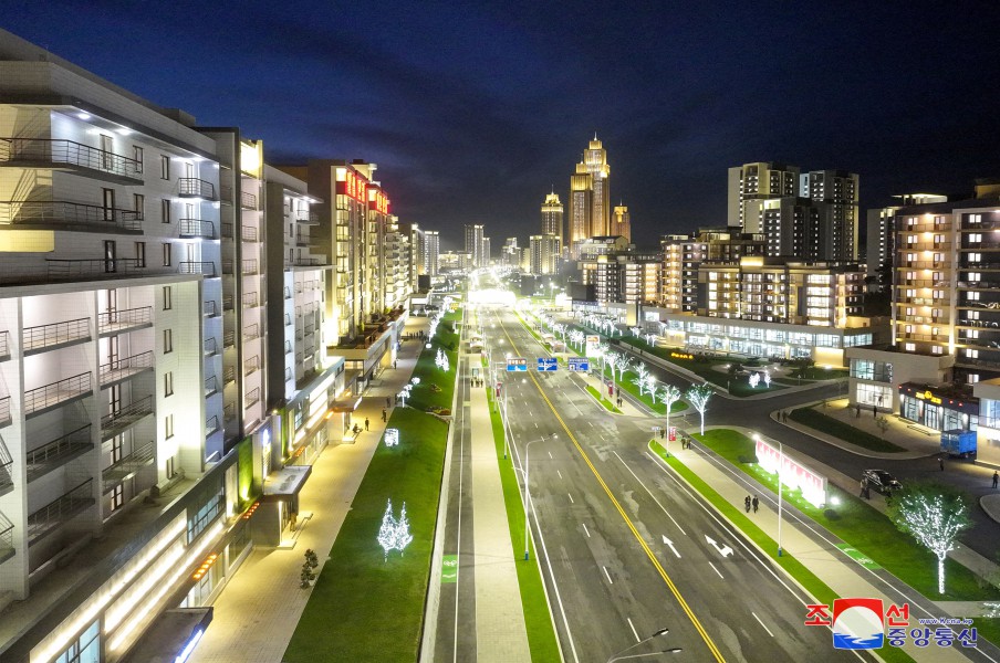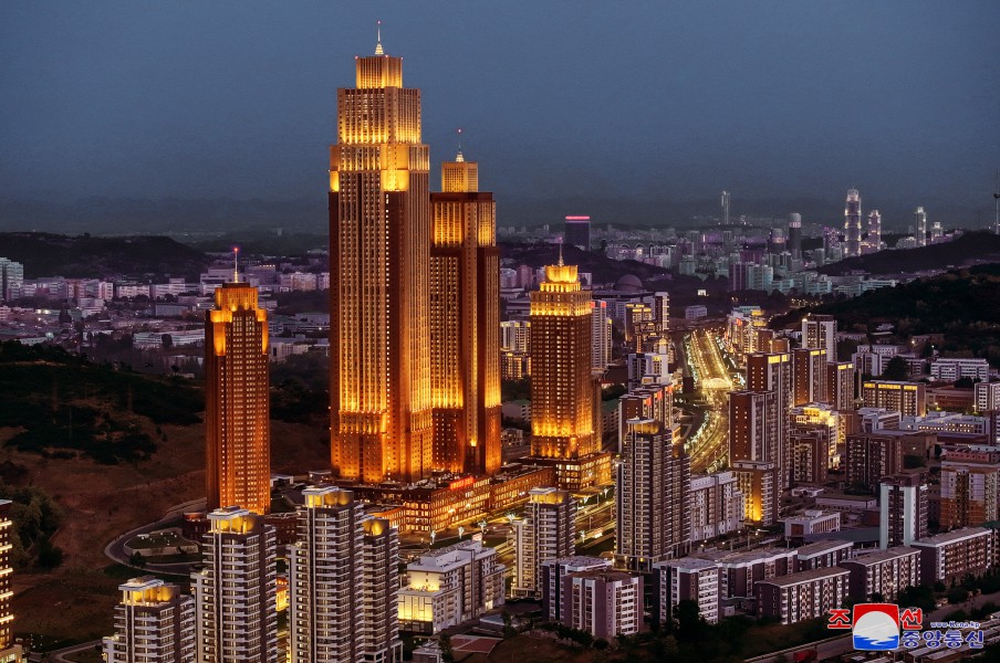 80層高樓等形式各樣的高層、超高層樓房和公共建筑物展現在眼前,蔚為壯觀(guān)。這座大建筑群是以熱烈的愛(ài)國心擁護并保衛黨的事業(yè)的可靠青年先鋒獻禮祖國和人民的驕傲勞動(dòng)成果,是朝鮮式社會(huì )主義蓬勃前進(jìn)的產(chǎn)物。