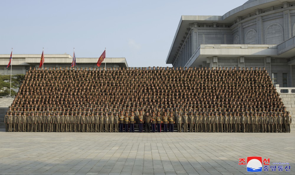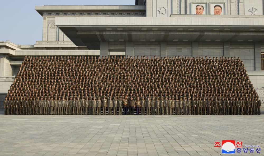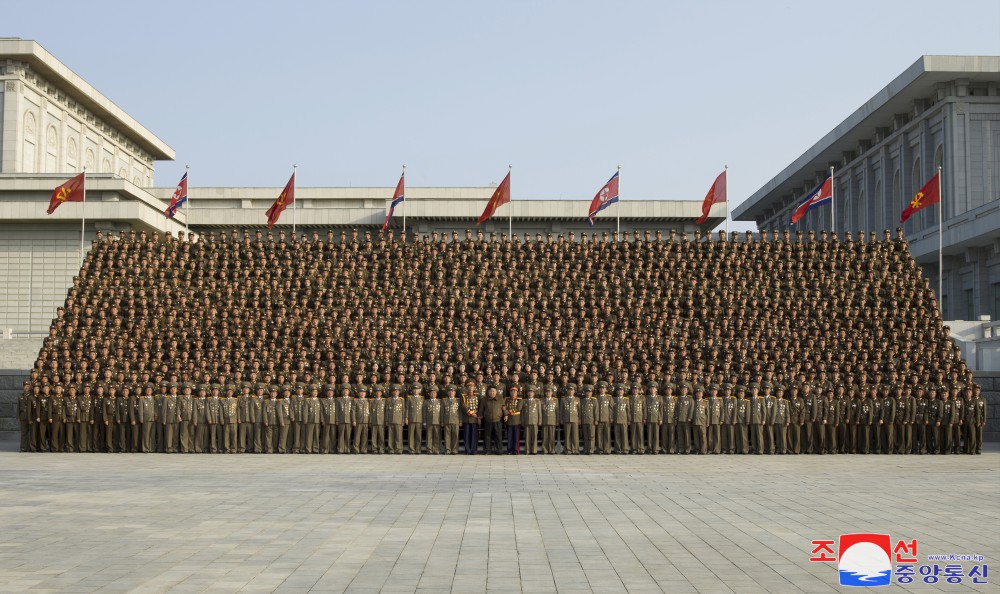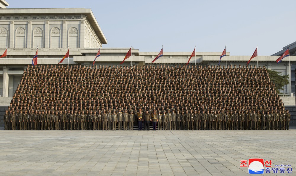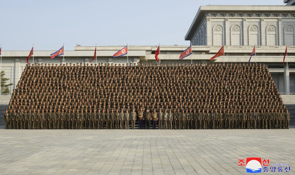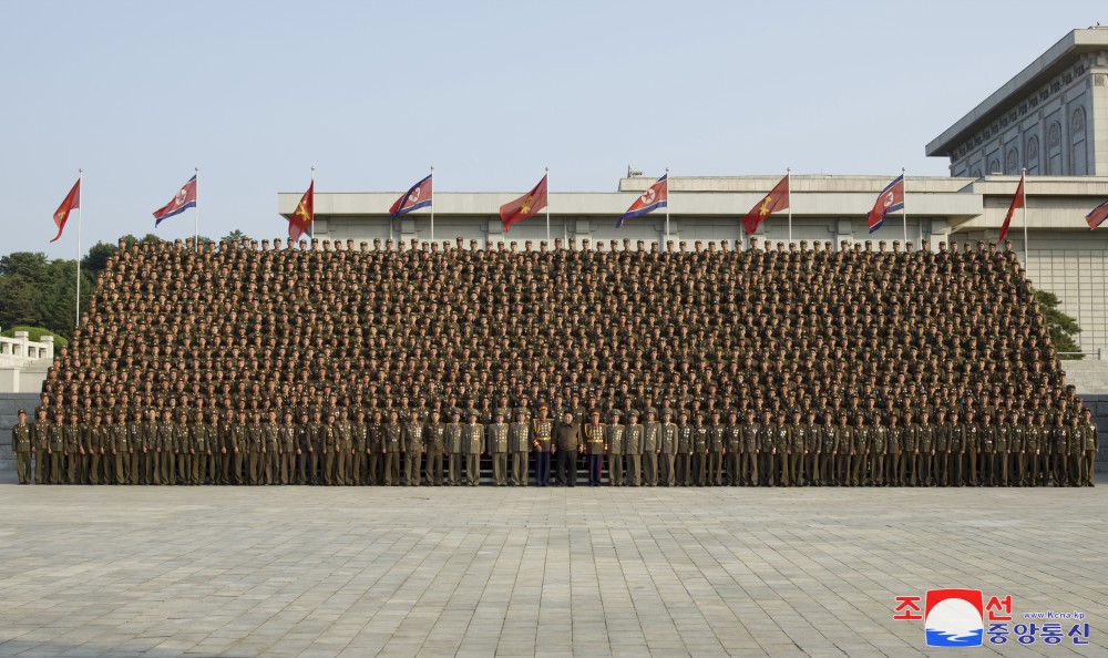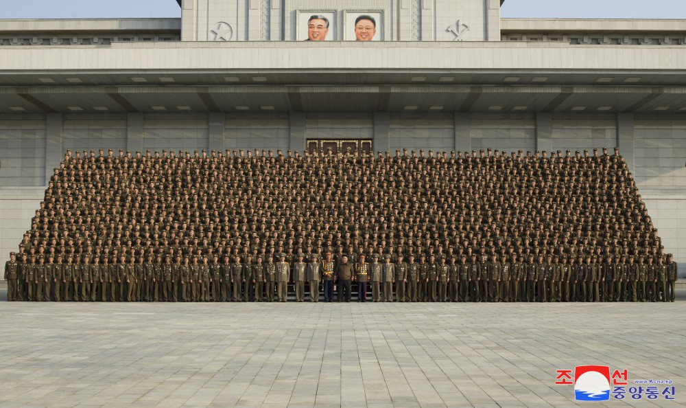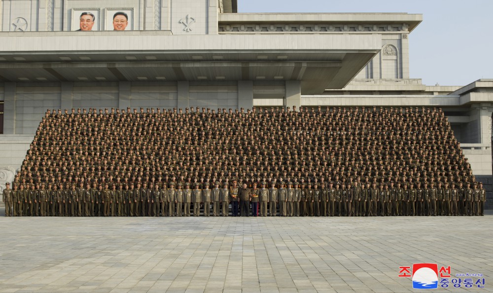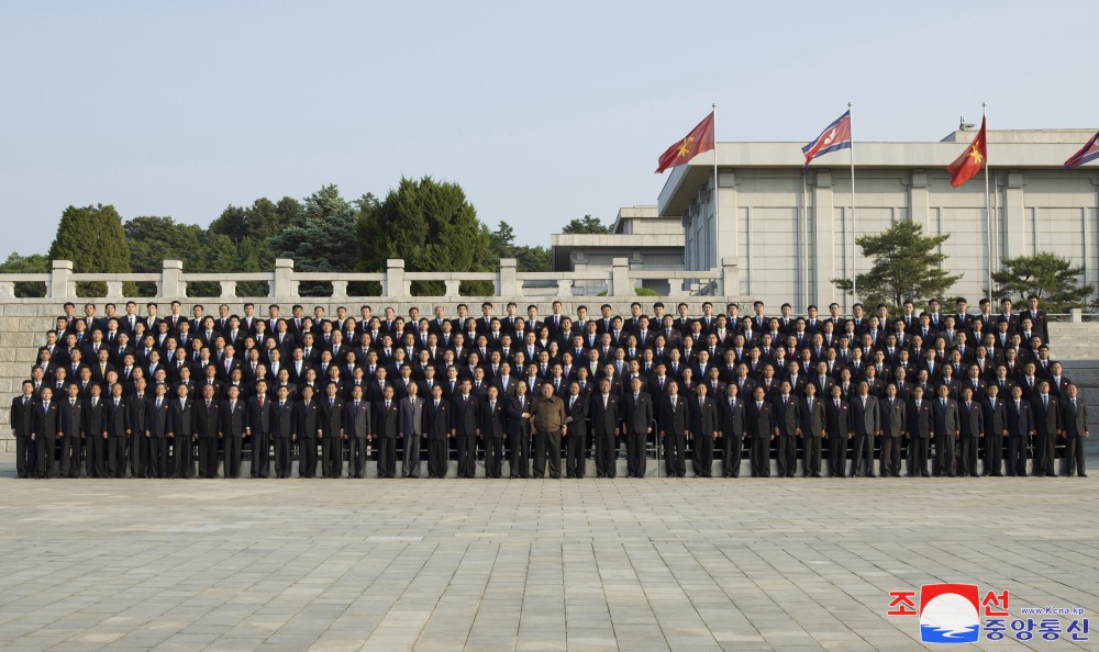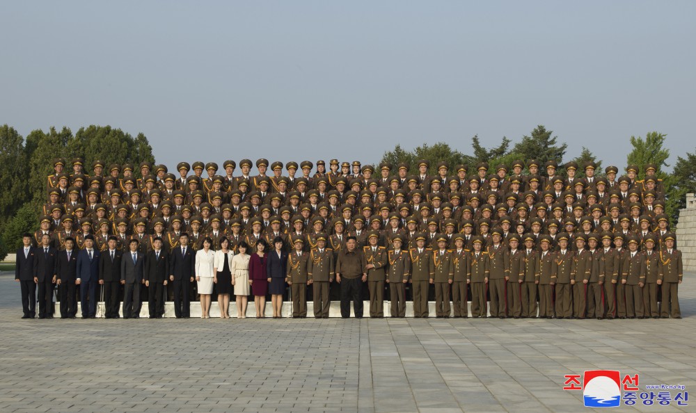 全體參加者為同敬愛(ài)的金正恩同志合影留念,心中澎湃著(zhù)無(wú)限感激和歡喜。