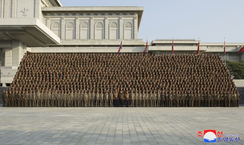 敬愛(ài)的金正恩同志抵達攝影場(chǎng)所時(shí),全體參加者仰望著(zhù)卓越的導師、創(chuàng )造和建設的偉大權威爆發(fā)出雷鳴般的“萬(wàn)歲”歡呼聲。