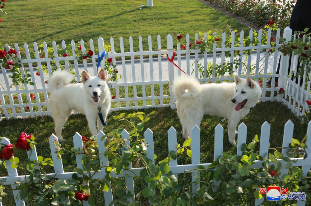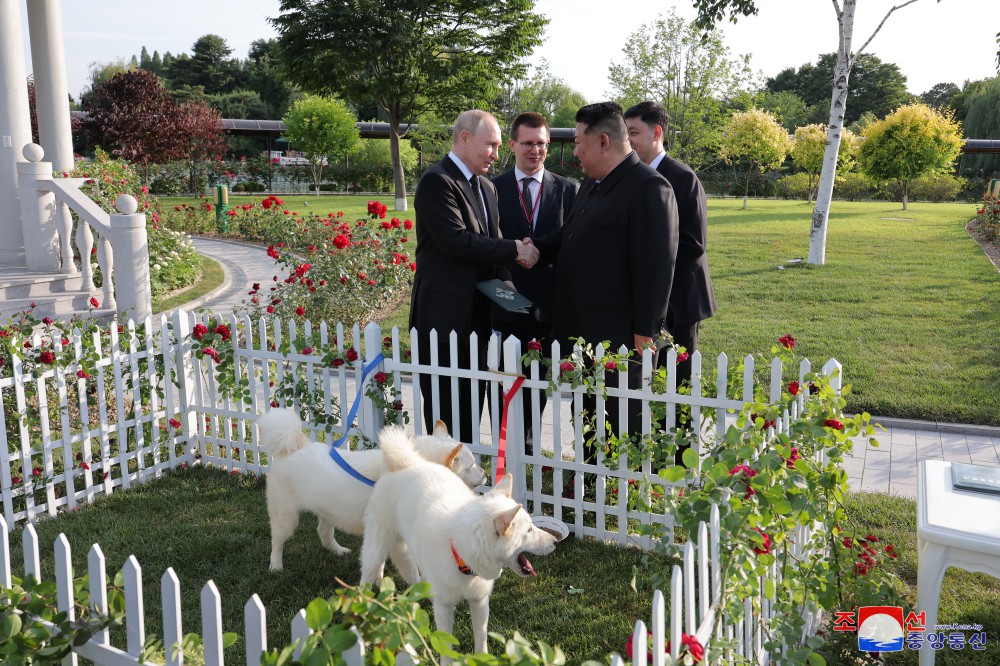 金正恩同志在錦繡山迎賓館庭院向普京同志贈送了我國國犬豐山狗一對。