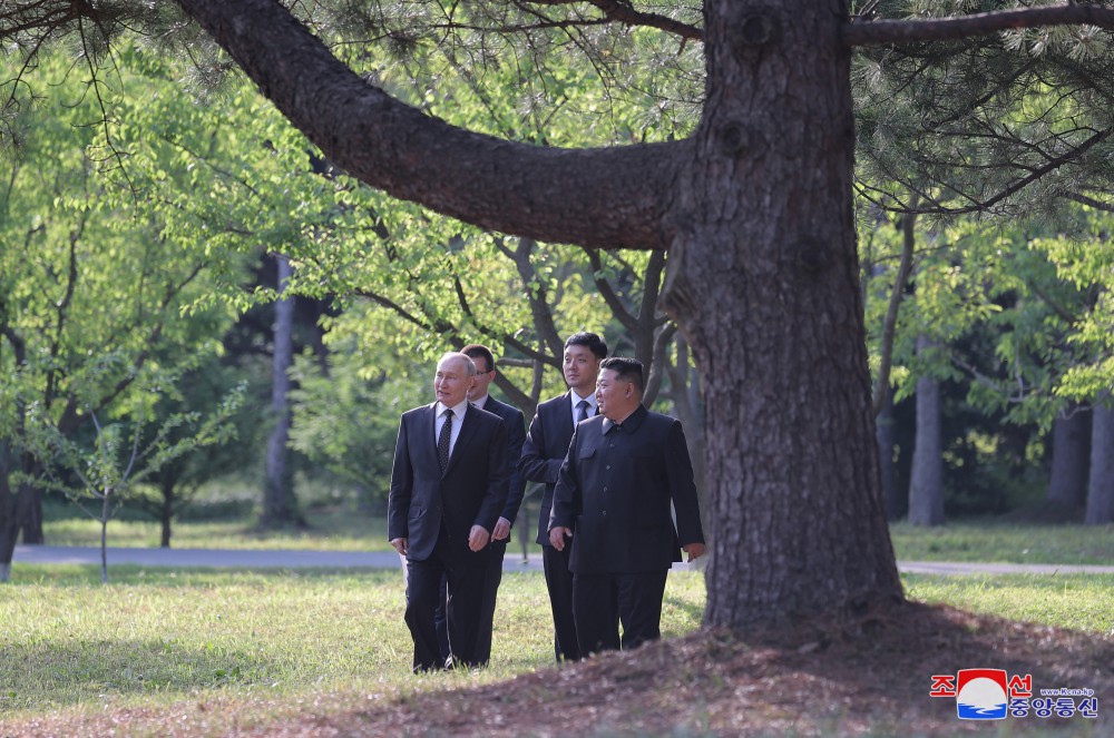 朝中社平壤6月20日電 敬愛(ài)的金正恩同志簽署歷史性的《朝鮮民主主義人民共和國和俄羅斯聯(lián)邦關(guān)于全面戰略伙伴關(guān)系條約》后,同俄羅斯聯(lián)邦總統普京同志一起在錦繡山迎賓館庭院共度時(shí)光,加深友情。