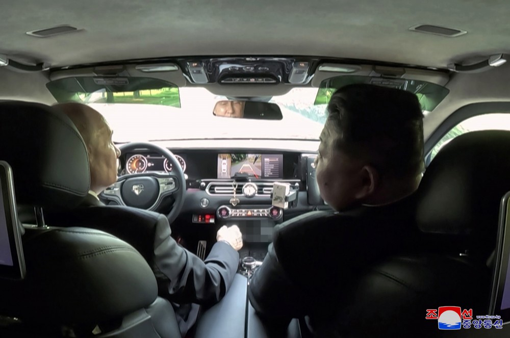 兩國最高首腦同乘普京同志贈送金正恩同志的轎車(chē),輪流開(kāi)車(chē),在迎賓館區內兜風(fēng)。