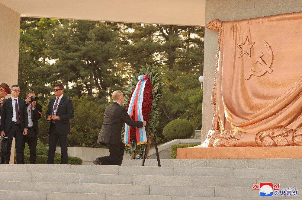朝中社平壤6月20日電 正在我國進(jìn)行國事訪(fǎng)問(wèn)的俄羅斯聯(lián)邦總統普京同志6月19日向解放塔敬獻花圈。