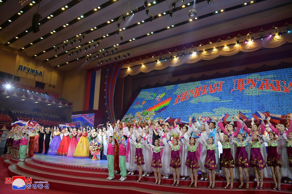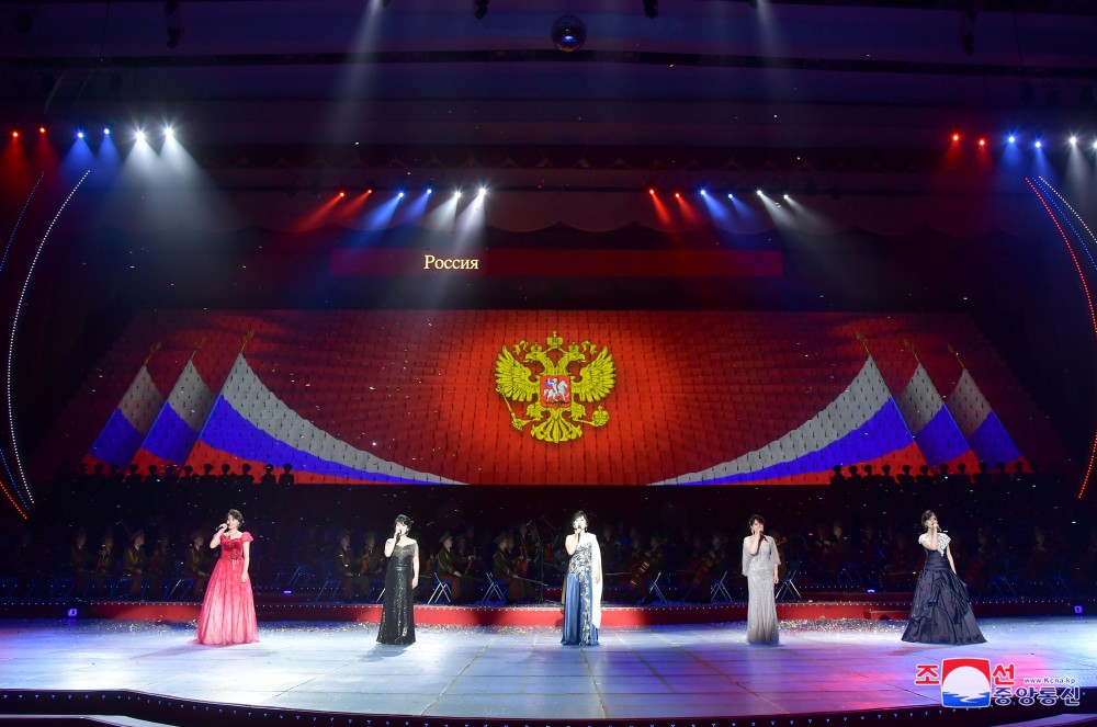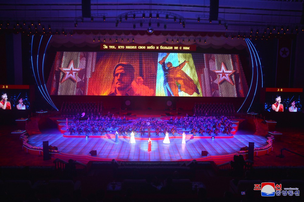 演出以綜合軍樂(lè )儀式拉開(kāi)帷幕,把一臺精彩紛呈的節目獻給了全場(chǎng)觀(guān)眾。表演節目反映了朝俄兩國人民在克服歷史的一切挑戰,維護正義與真理的神圣年代里高度發(fā)揚的革命氣概和崇高愛(ài)國主義精神以及民族情趣。