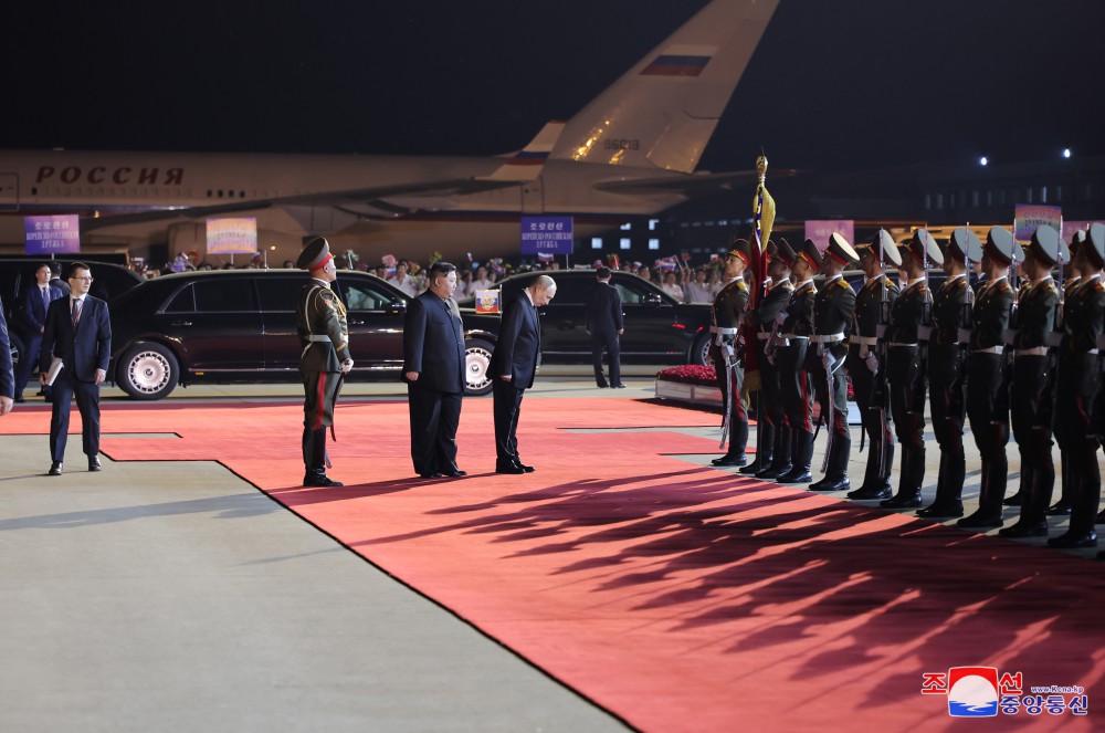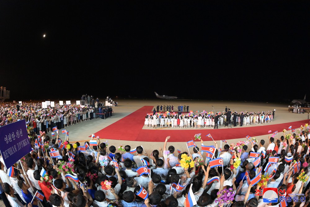 在平壤國際機場(chǎng),朝鮮民主主義人民共和國國旗和俄羅斯聯(lián)邦國旗迎風(fēng)飄揚,停機坪上,朝鮮人民軍儀仗隊整齊列隊,眾多群眾和可愛(ài)的兒童在場(chǎng)等候。