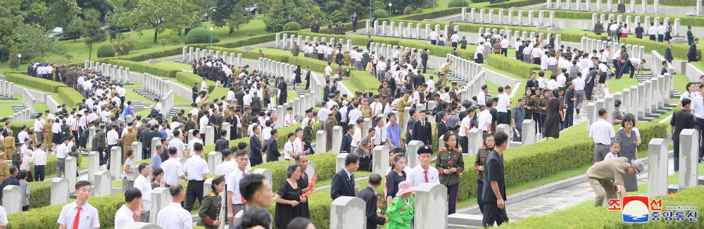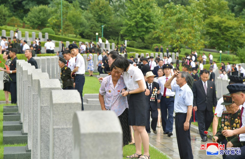 朝中社平壤7月27日電 迎接偉大的戰勝節的全國人民絡(luò )繹不絕地前往強大的我們國家有尊嚴的國旗和朝鮮勞動(dòng)黨黨旗守護著(zhù)戰爭烈士英靈的石礴山腳下永生之崗,向英烈表達無(wú)盡的敬意。