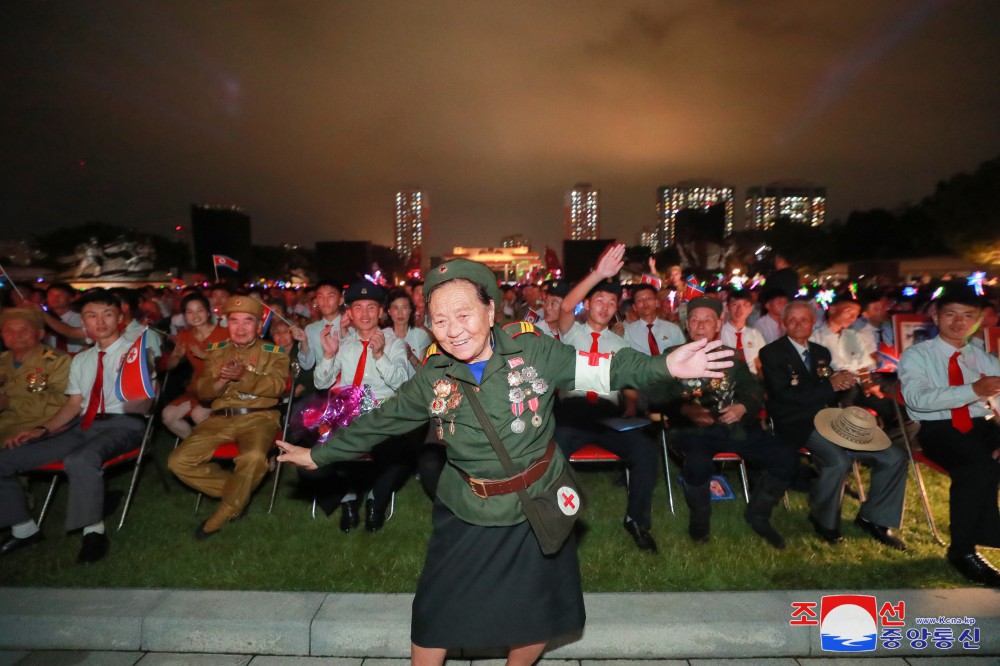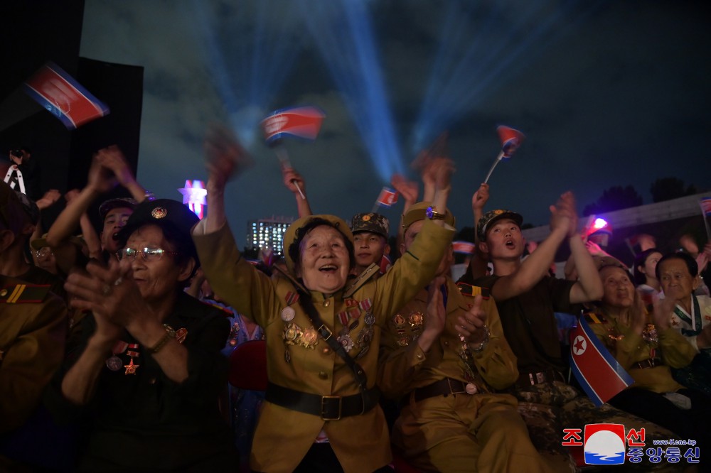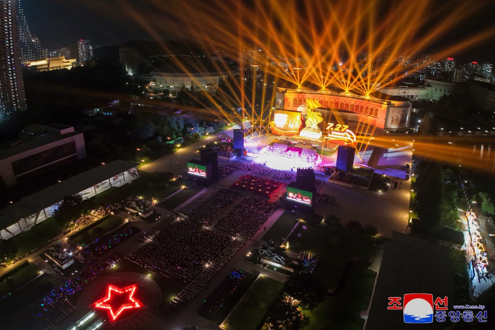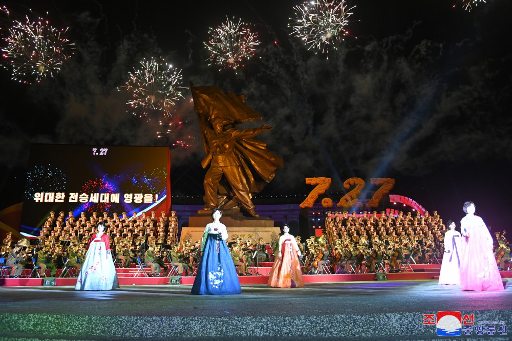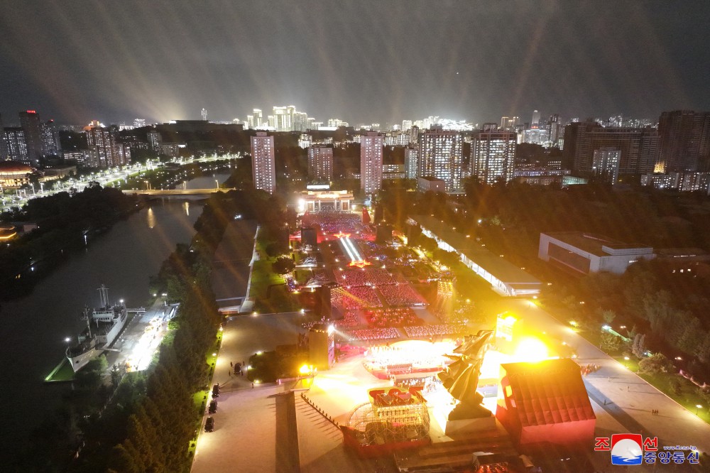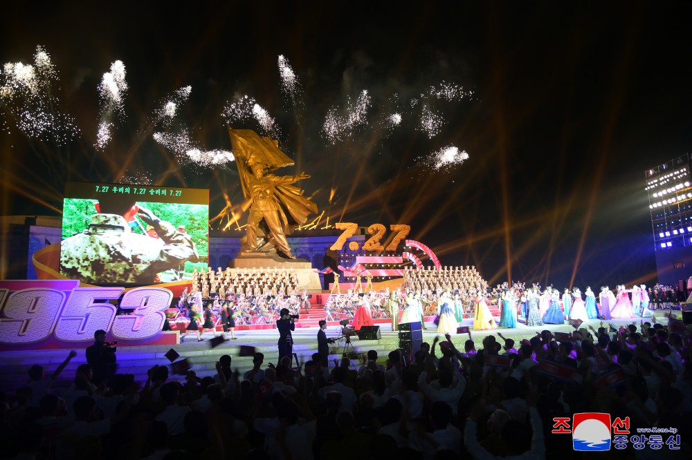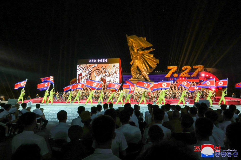 朝中社平壤7月28日電 一場(chǎng)盛大的慶祝演出7月27日晚在祖國解放戰爭勝利紀念塔前隆重舉行,為享有尊嚴的朝鮮民主主義人民共和國的不朽名譽(yù)和必勝象征——偉大的戰勝節增加喜慶氛圍。