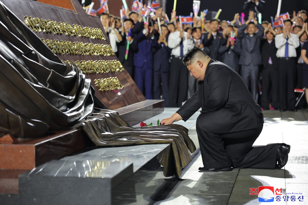 五彩繽紛的禮花變成獻給在朝鮮革命生死攸關(guān)的年代以偉大的信念和團結的威力創(chuàng )造最正義力量之神話(huà)的戰勝年代人的“花雪”,照亮了不朽的“勝利”雕像和英雄戰士群像。