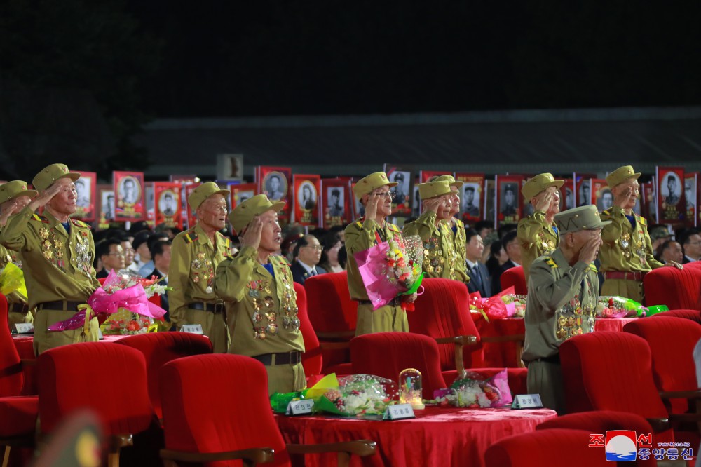 全體參加者肅立仰望著(zhù)“7·27”的英雄戰士們以鮮血染紅且滲透著(zhù)戰后70多年來(lái)革命的每一年代人為捍衛寶貴勝利而付出的高貴精神以及主體朝鮮輝煌未來(lái)的朝鮮民主主義人民共和國國旗。