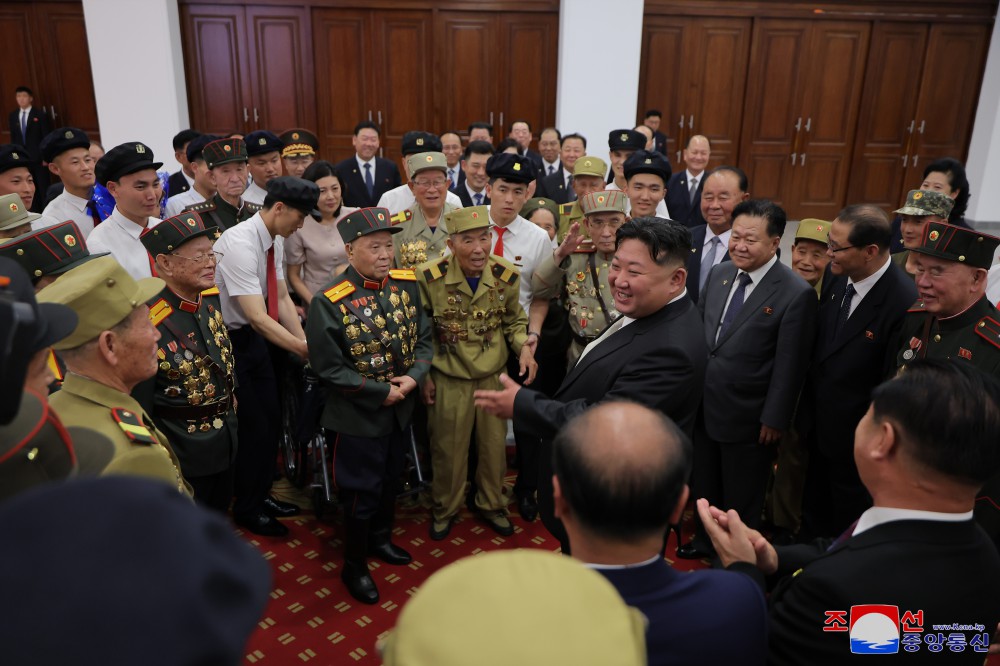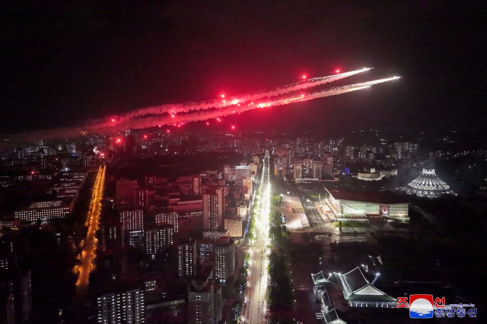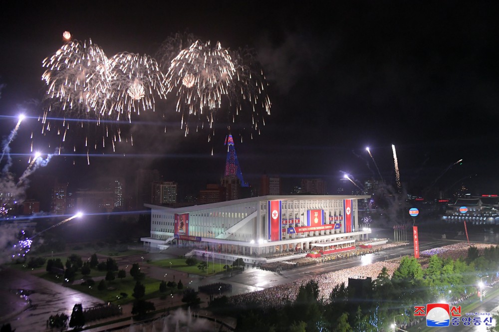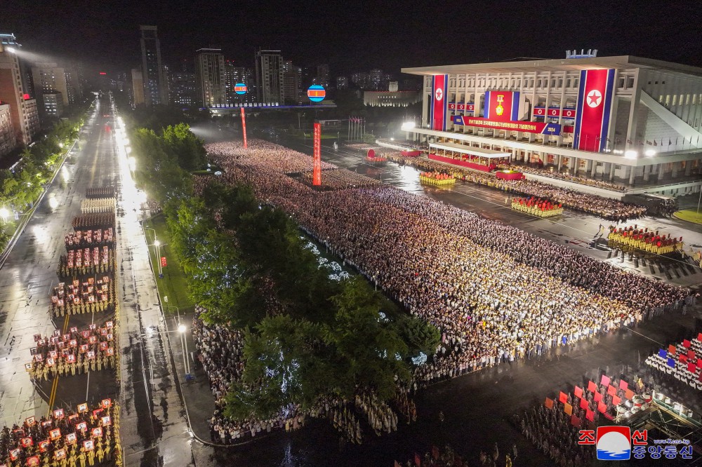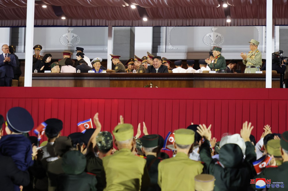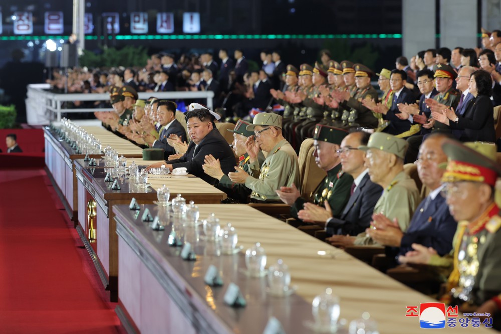 祖國解放戰爭勝利71周年慶?;顒?dòng)參加者和黨中央委員會(huì )干部,人民軍官兵,各省和中央一級機關(guān)、平壤市內干部,勞模,革命學(xué)院學(xué)員和大學(xué)生在觀(guān)眾席就坐。