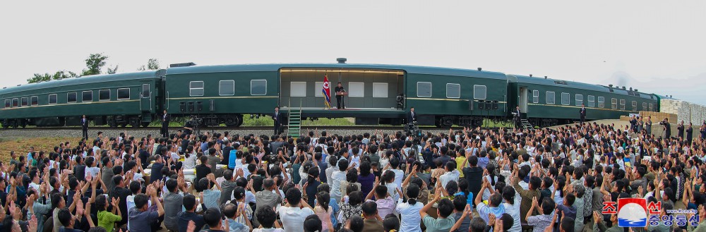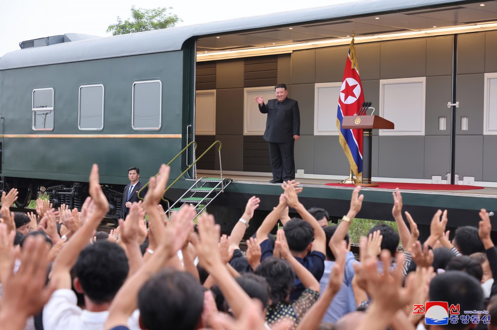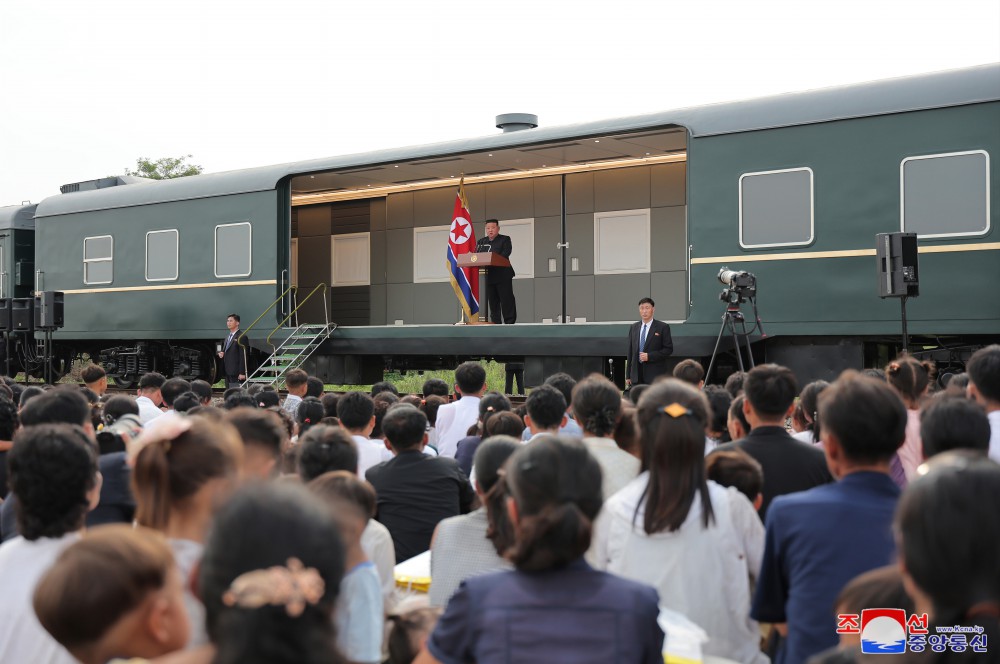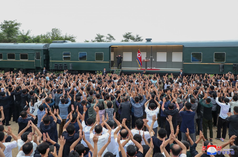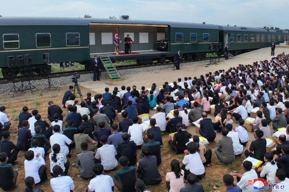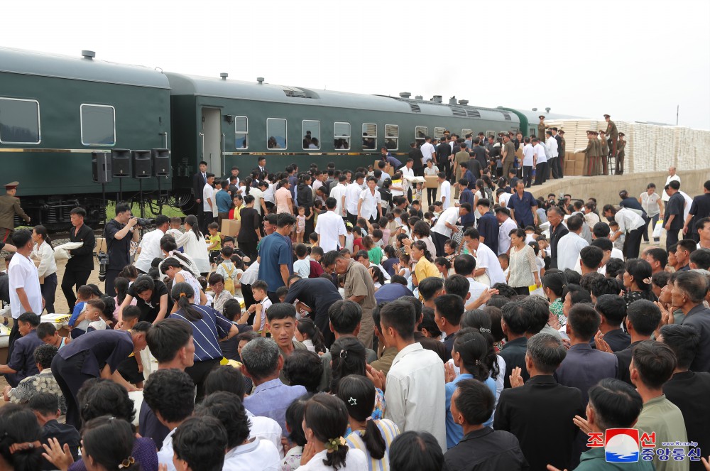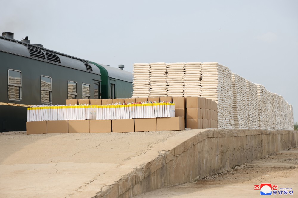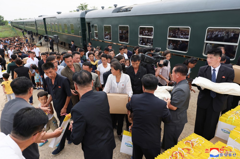 金正恩同志用自己的專(zhuān)列運來(lái)黨中央委員會(huì )為新義州市和義州郡災民籌備的支援物資,并指示把這些支援物資轉交給災民。