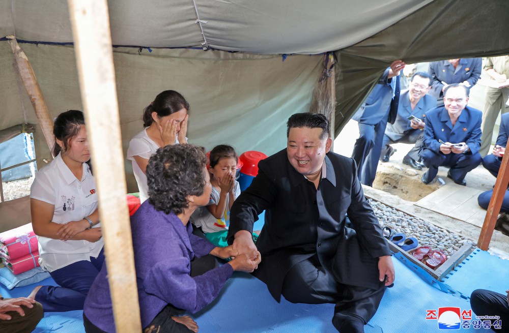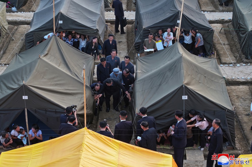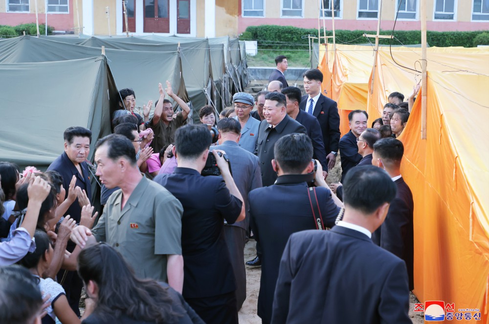 此后,敬愛(ài)的金正恩同志前往災民臨時(shí)住宿的帳篷區,會(huì )見(jiàn)他們表示親切的慰問(wèn)。