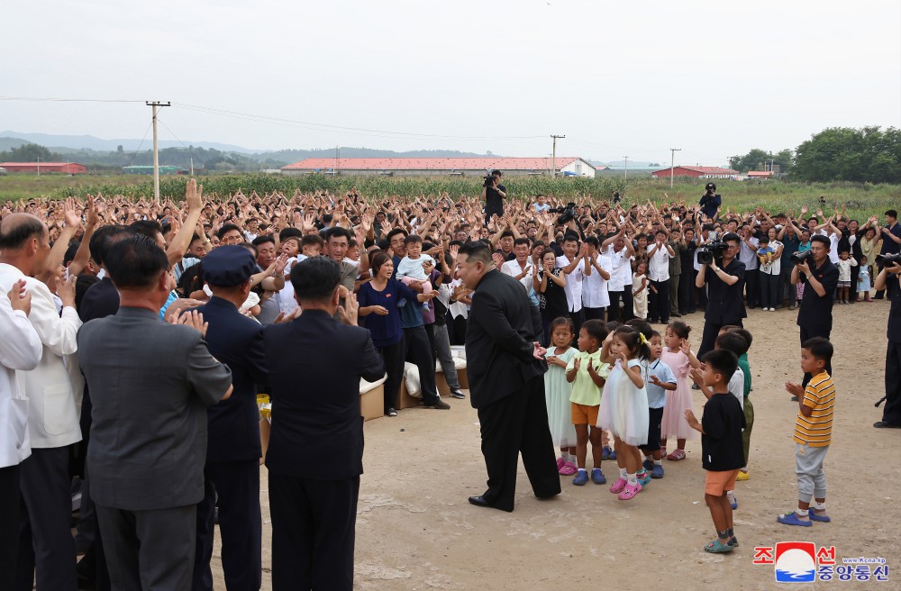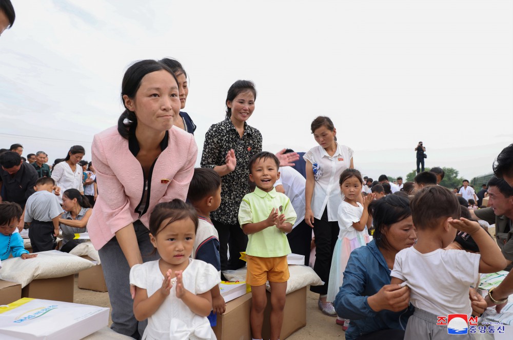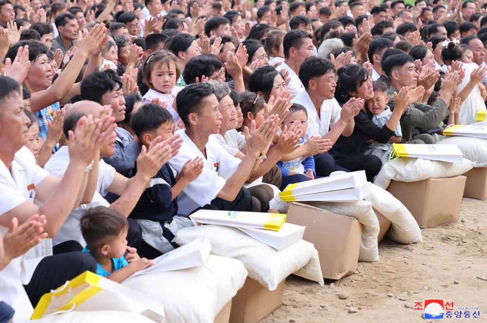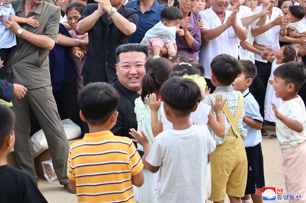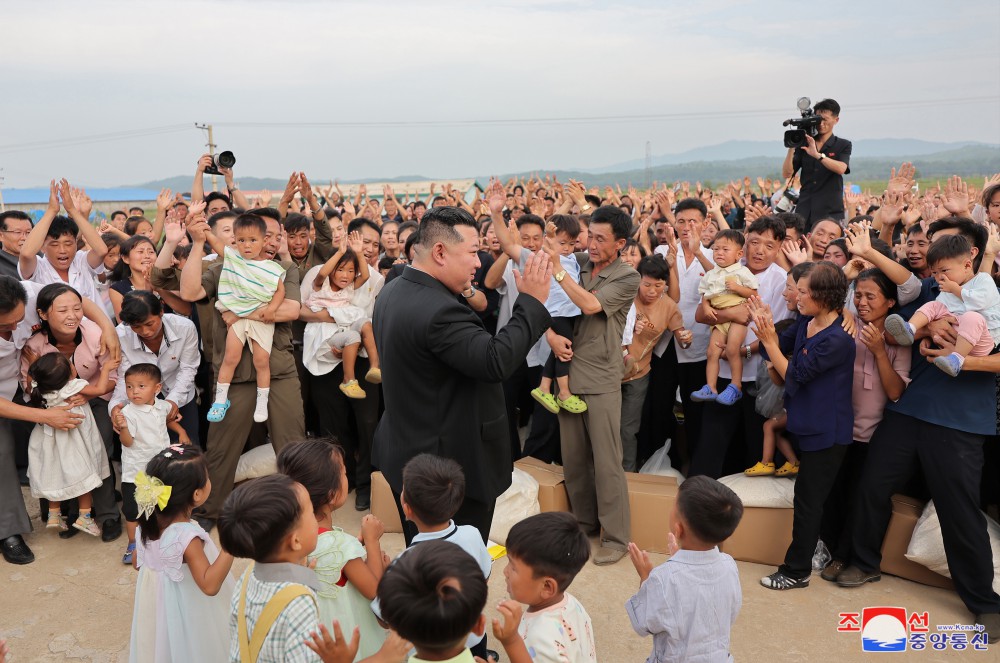 敬愛(ài)的金正恩同志8月9日再次探望義州郡災民,闡明我們黨和政府有關(guān)救災重建的立場(chǎng),采取重大措施,并撫慰他們。