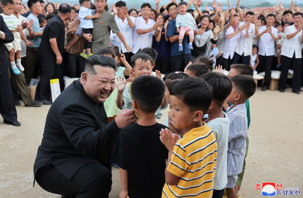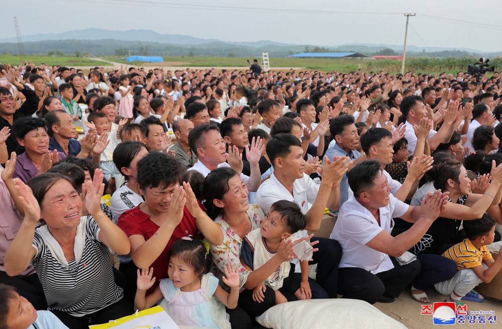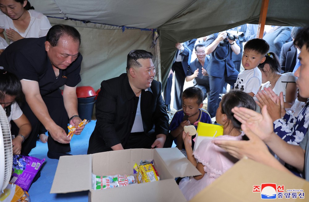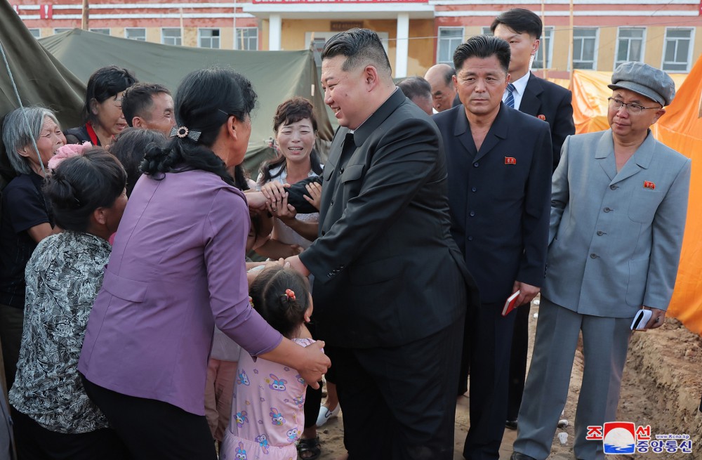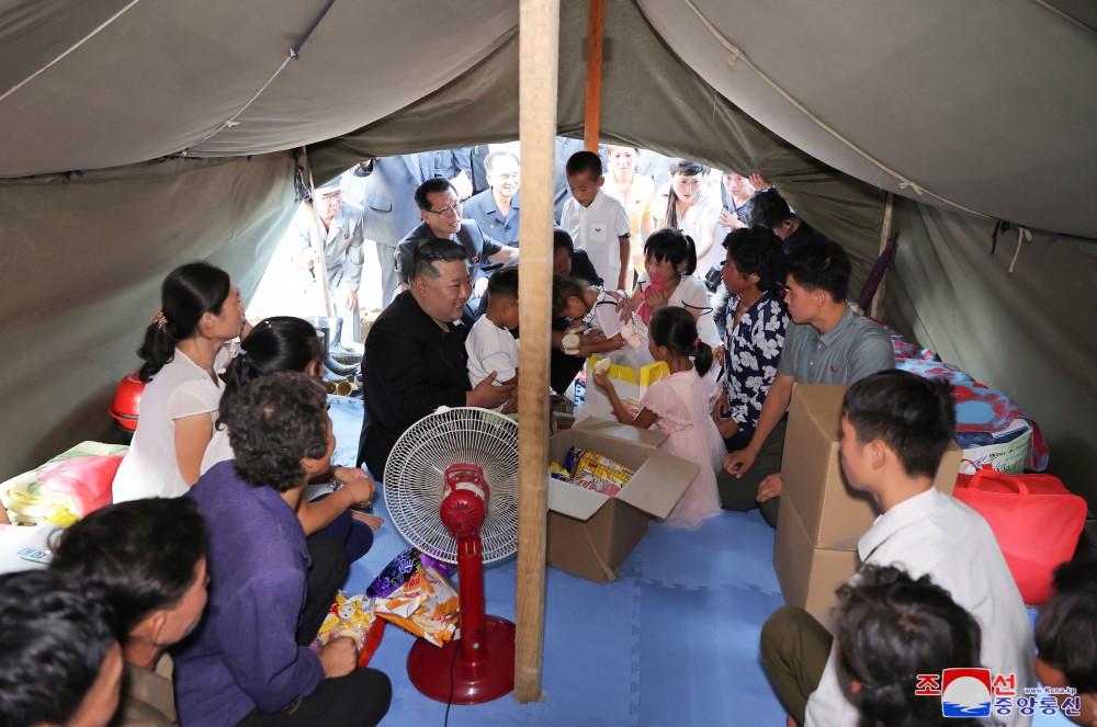 敬愛(ài)的金正恩同志8月9日再次探望義州郡災民,闡明我們黨和政府有關(guān)救災重建的立場(chǎng),采取重大措施,并撫慰他們。