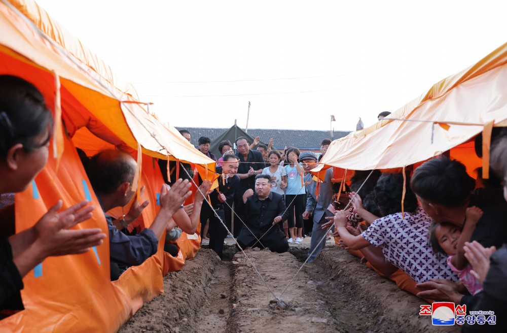 金正恩同志為無(wú)家可歸的災區人民早日提供完美的家園而部署神圣的斗爭戰線(xiàn),并于8月8日再次前往義州郡災區撫慰災民。