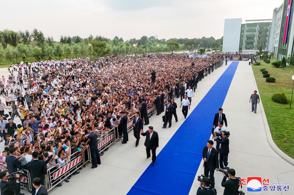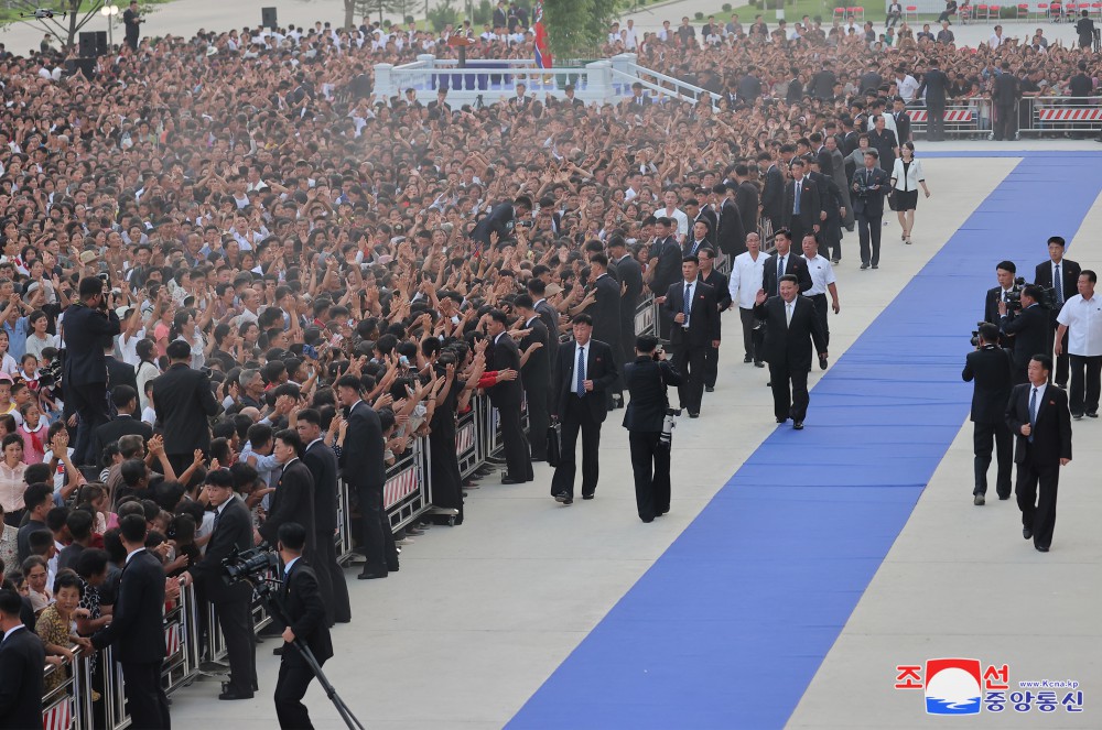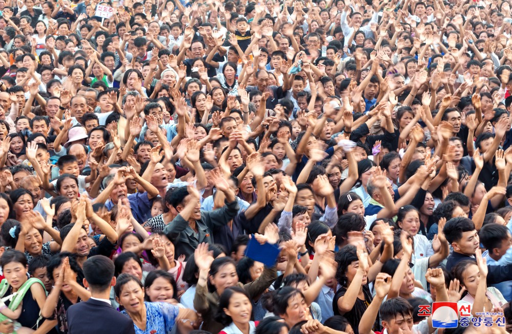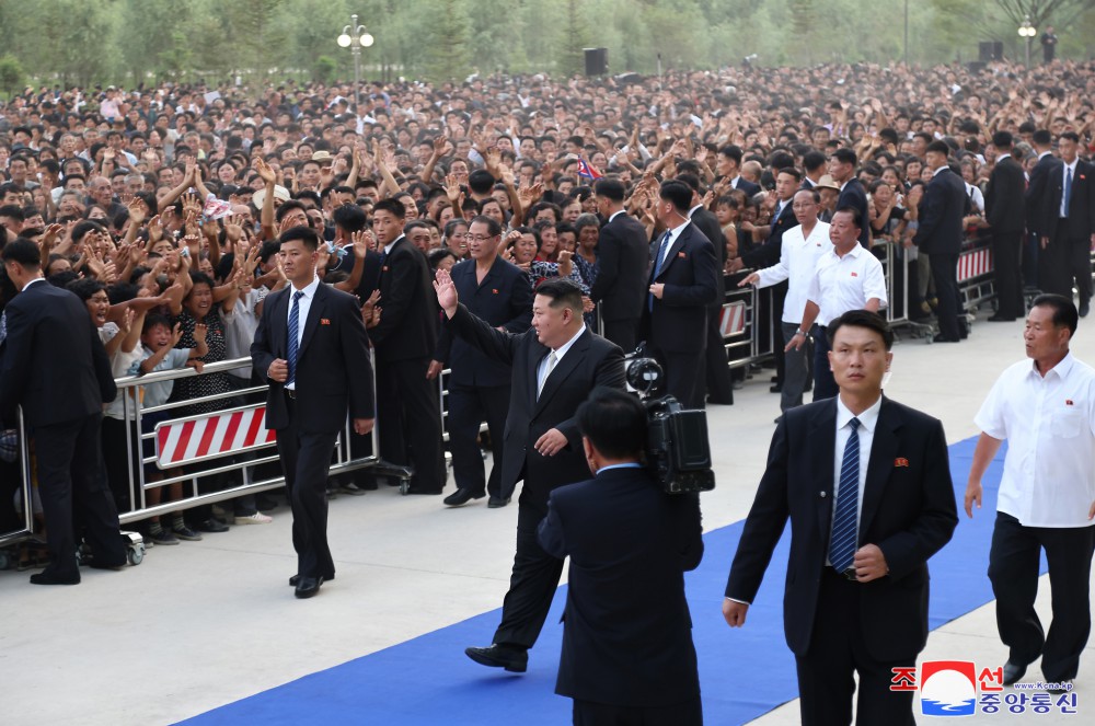 金正恩同志向熱烈歡呼的群眾揮手還禮。